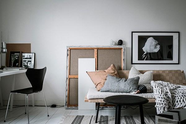 Por eso al encontrar las imágenes de este mini apartamento se me ha ocurrido que podría ser ese lugar en el que me imagino, leyendo un libro, trabajando en silencio en el ordenador, echando una siesta sin hora de despertar… aburriendome, sencillamente pasando una tarde aburrida. Tiene en pocos metros todo lo necesario, pero sin estar excesivamente lleno de cosas innecesarias, por eso, por su poca capacidad de almacenamiento no acabo de verlo como primera vivienda, pero si que encuentro ciertos detalles decorativos de los que poder tomar nota.