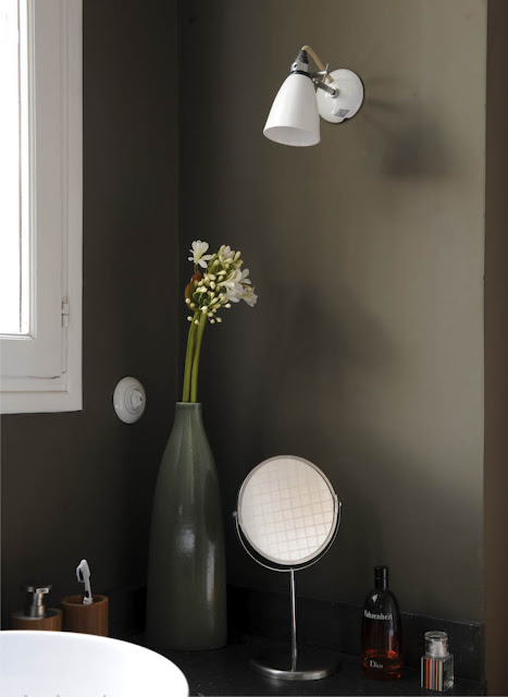 Al baño se accede directamente desde el dormitorio, sin puertas que interfieran el paso de luz. El negro pizarra presente en las paredes y la encimera del lavabo es su seña de identidad y define su fuerte personalidad. Detalle del mini vestidor, con el perchero mod. "Hang it all", de los Eames. Un taburete de Atelier hace las veces de mesita. Sobre él, lámpara de Noguchi. En el dormitorio predomina la sencillez.