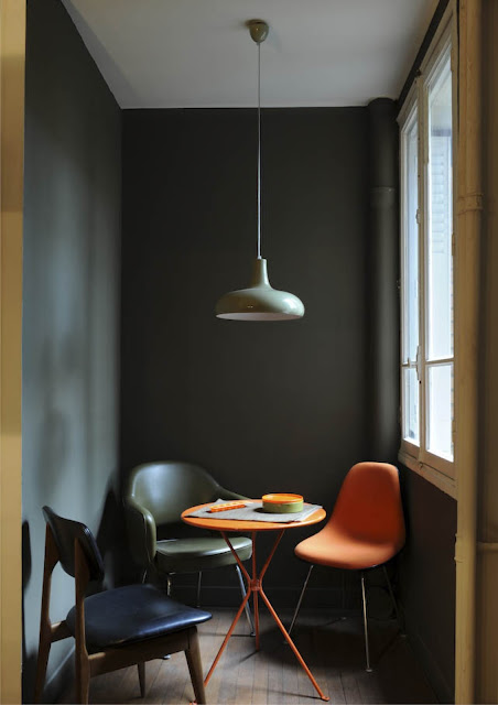 Eames, la butaca de Eero Saarinen y una silla de Habitat. La lámpara colgante retro con el fondo de pared en gris marengo completan el espacio sereno donde la luz penetra a través de un estupendo ventanal.