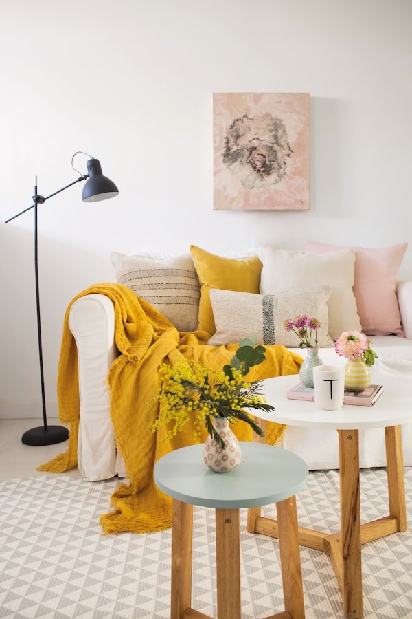 Gracias a una ventana en el techo inclinado del dormitorio y a la ventana que hay en la cocina, la vivienda disfruta de mucha luz natural. Todo ello combinado con una decoración en tonos claros, blancos, beiges y contrastes en amarillo, se crea un ambiente de amplitud y delicadeza en toda la vivienda.