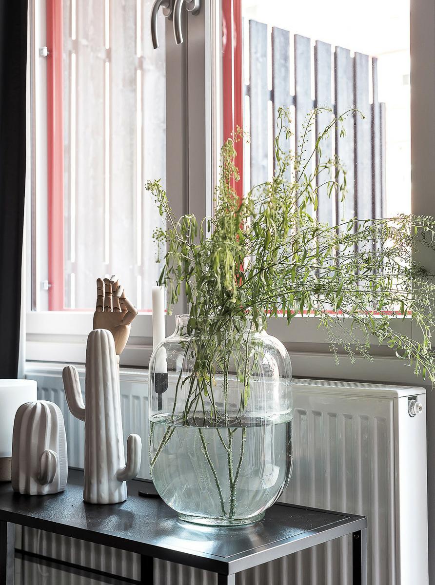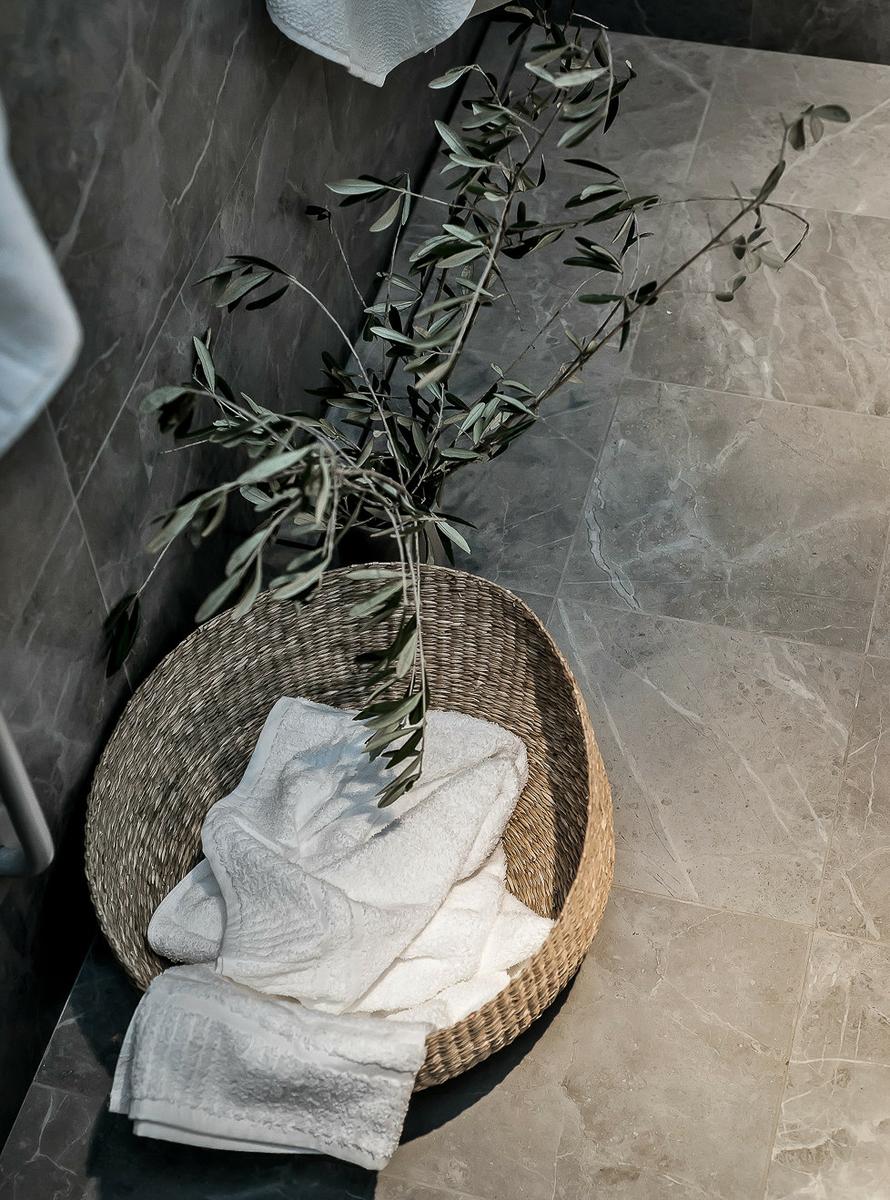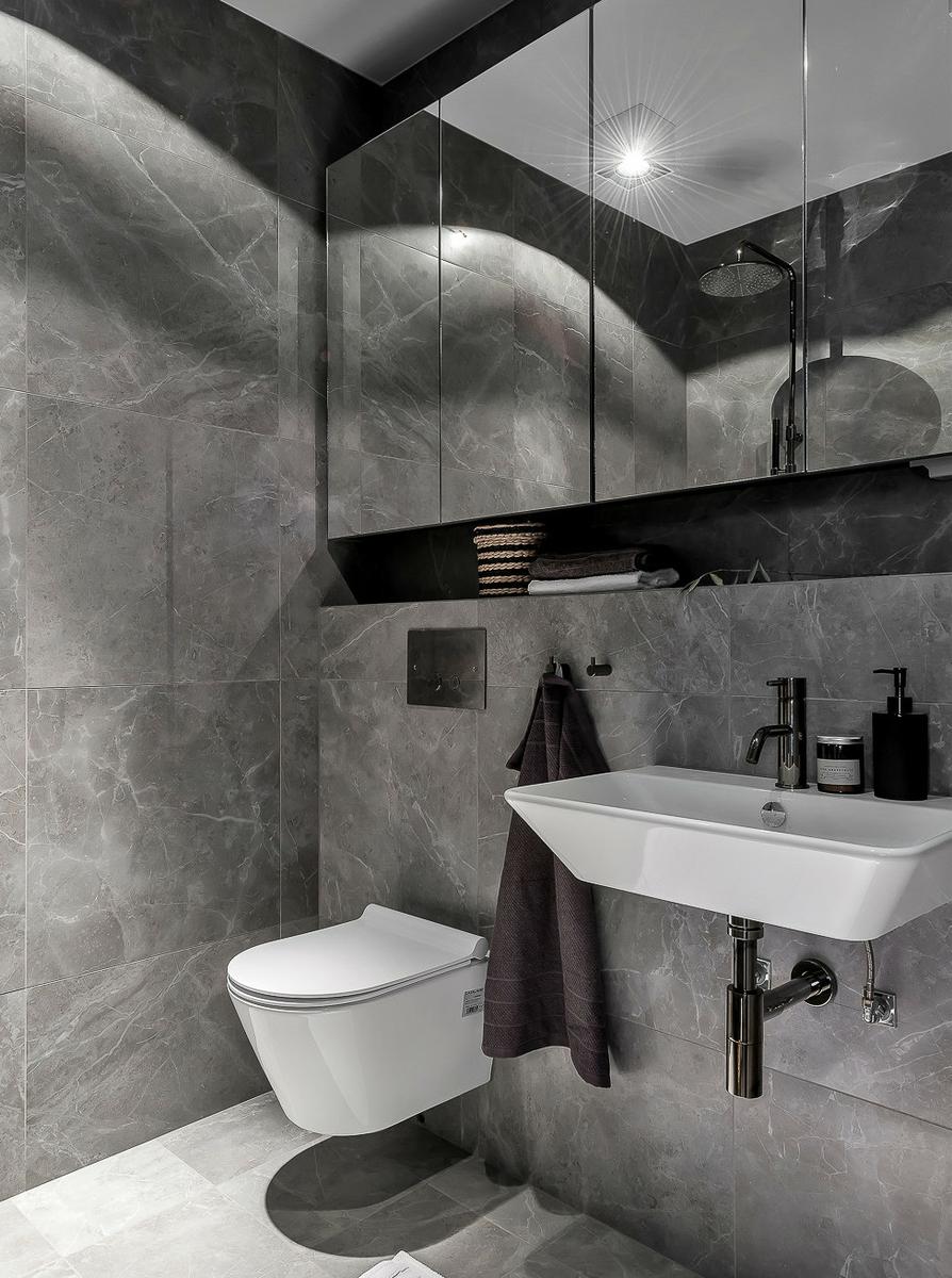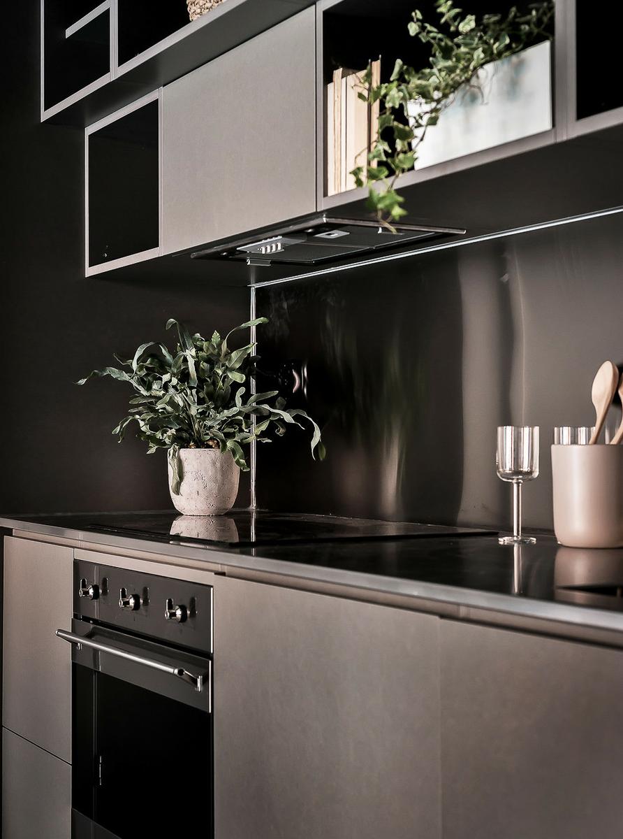 El tono masculino no sólo parte del color, los decorativos así como los materiales algo minimalistas e industriales, con los muebles de la cocina imitando a hormigón, el frente de acero, y el mármol oscuro en el baño, refuerzan esa sensación. La entrada de luz por los grandes ventanales, da sensación de ligereza y amplitud al conjunto.