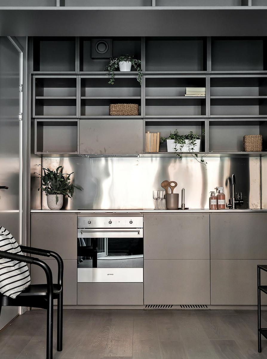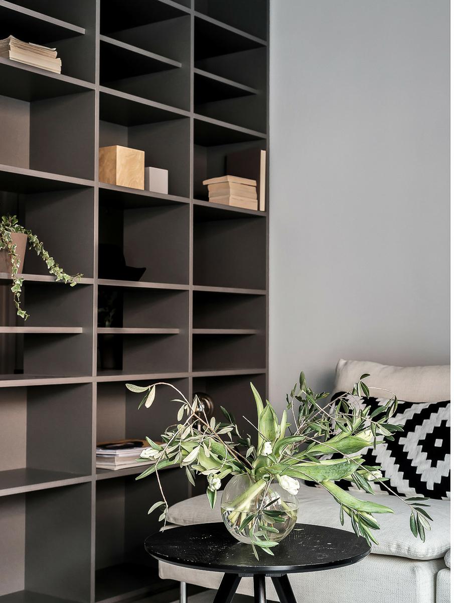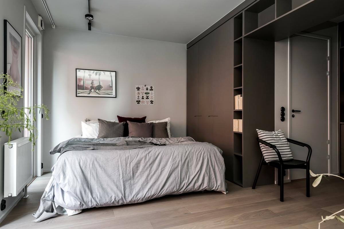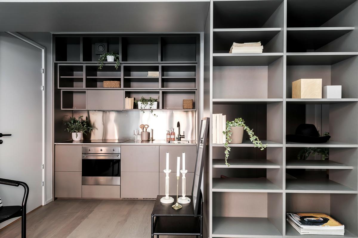 Con un estilo funcional y urbano, este tipo de estudio o mini apartamento, nace de las limitaciones que ofrecen las nuevas construcciones, donde prima la falta de espacio y la ausencia de detalles. Si todo esto lo unes a un nuevo concepto de vida más urbanita y rápida, donde priman la comodidad y la practicidad, el resultado son interiores como este, elegantes y con todo pensado al detalle. En un concepto completamente abierto, el espacio social y el privado comparten la misma estancia, unificando paleta de color para crear un todo unitario. Un gran elemento de estantería a modo de contenedor de almacenamiento, hace de separador con la cocina, en gris. El solado en acabado madera, aportan confort y calidez al conjunto.