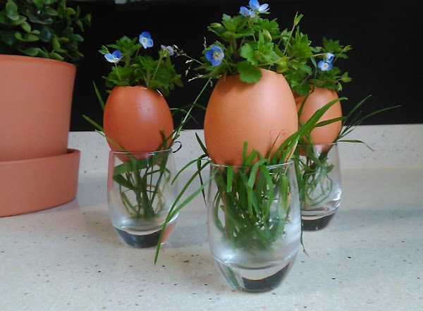 Llenamos el vaso de hierba y colocamos encima la cáscara de huevo con un poco de agua en su interior.
