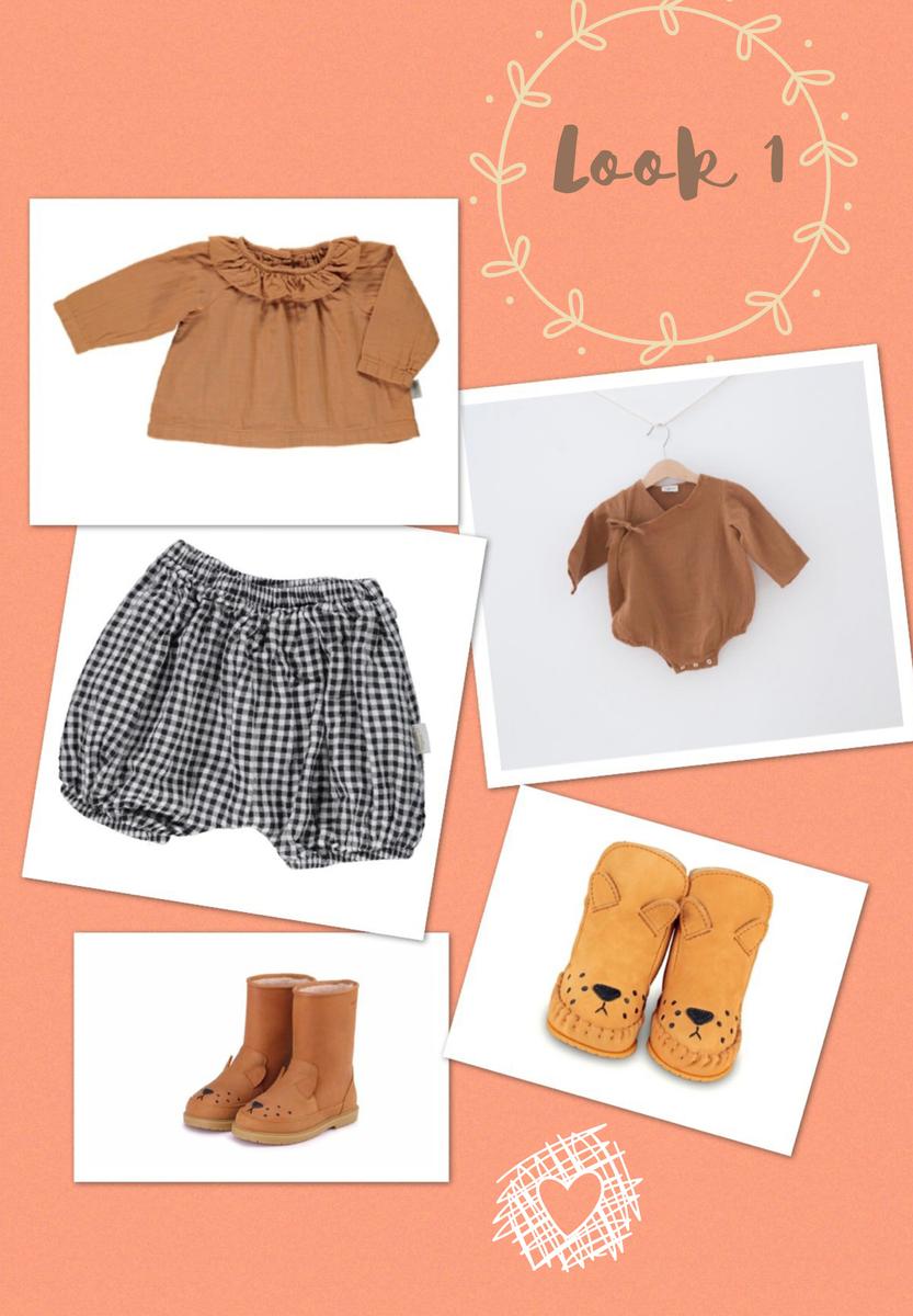 El primer look acorde a mis tonalidades preferidas. Para bebés me encantan los peleles y más en formato de Kimono, además lo encuentro bastante unisex. Para Valentina me he decantado por una camisa de los mismos tonos y unos volantes en el cuello combinados con unos bombachos a cuadros vichy (también hay la opción de falda en la misma tela). Y para rematar las dos con las botitas de la coleccion de Donsje.