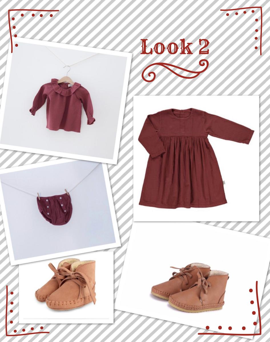 Para este segundo look, he seleccionado dos colores más navideños con telas bastante similares. En este caso para bebés (Julieta) me decanto por una camisa con volantes conjuntado con un culotte abotonado. Y para mayores un vestido súper cómodo y con una caída preciosa. En este caso también las he combinado con las botitas de piel de donsje, unas de suela blanda para bebés o las otras con suela de goma.