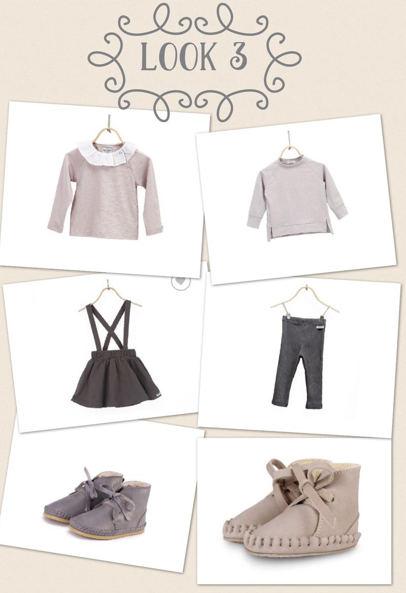 Un look más neutro y con colores muy básicos (que nunca fallan). Para todas las edades y combinaciones: dos jerseis del mismo color (un con cuello de volantes y otro sin, esto ya a gustos), y para la parte inferior conjuntado unos leggins con una falda de tirantes. En este caso también me he decantado por el calzado de donsje (¿se nota que soy una enamorada?) pero en color gris.