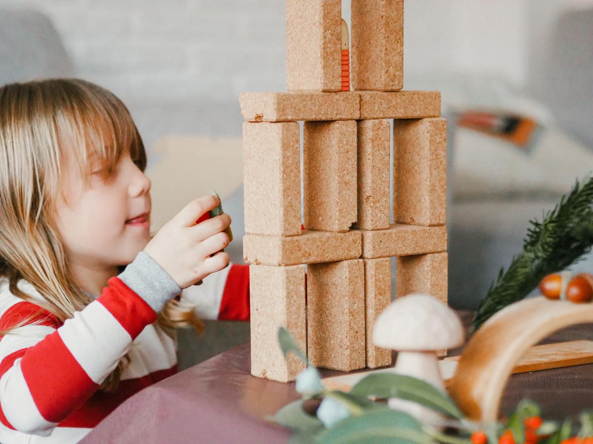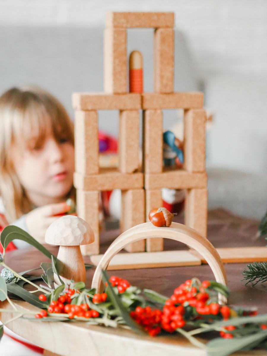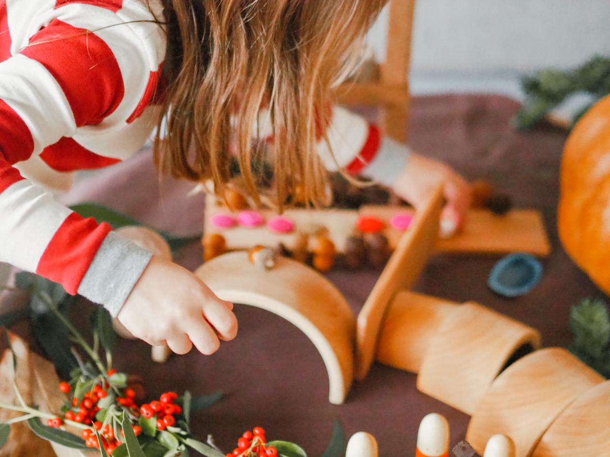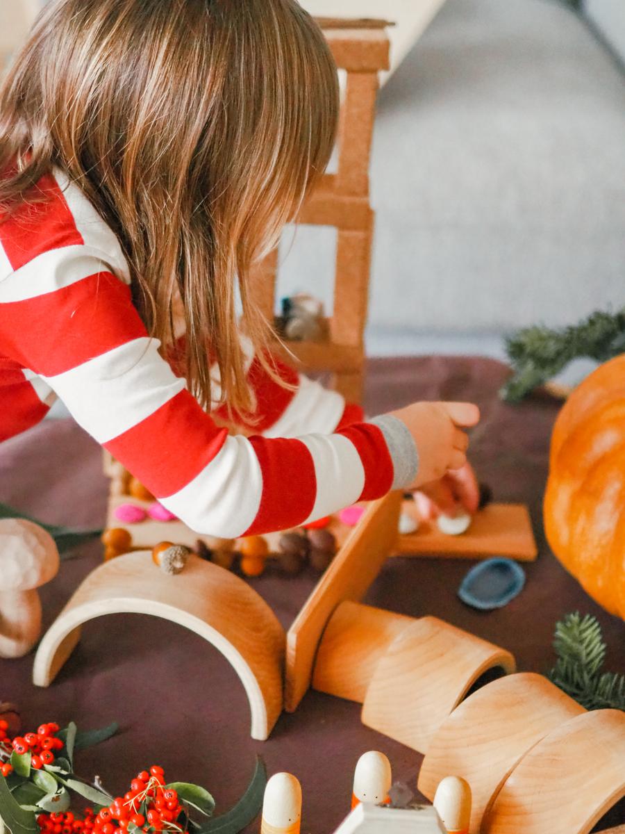 Siempre intento preparar el material sin que me vea (no siempre me es posible). Lo preparo de manera que invite a explorarlo y manipularlo, y…. ¡poco más! Me siento en una esquina de la habitación y dejo que ella vaya haciendo. Empezó jugando con los duendecillos y representando un diálogo entre ellos. A medida que iba explicando la historia que se inventaba iba buscando materiales para crear el escenario que se iba imaginando.