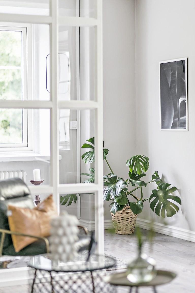 Mientras que el techo de madera fue repintado en blanco (para que sea menos abrumador el pequeño espacio), el centro de la estancia recuperó antiguas vigas de madera originales. Encaja perfectamente en el estilo de estilo nórdico elegido para el hogar, haciendo que la secuencia de tonos neutros en paredes y muebles sea menos monótona. Todo, desde paredes hasta el parquet, pasando por los sofás hasta textiles, explota los tonos sofisticados de este “sin color”.
