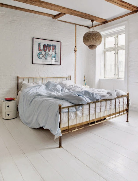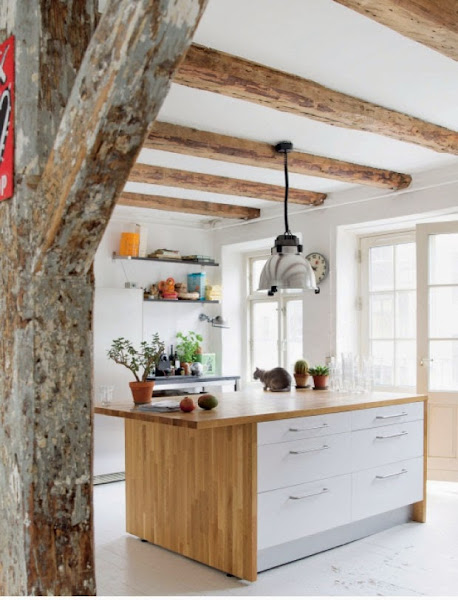 Espectacular casa la de hoy. Con más de 6 ventanales en el espacio abierto que comparten salón y cocina, la luz penetra fácilmente reflejándose en el blanco absoluto que predomina paredes, suelo y techo, sólo lo interrumpen las tradicionales vigas de madera, que por su desgaste parece que han formado parte de la vivienda durante un largo tiempo.