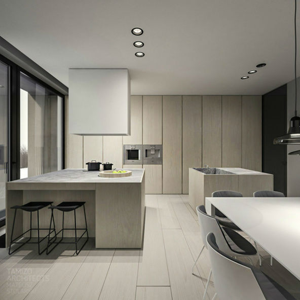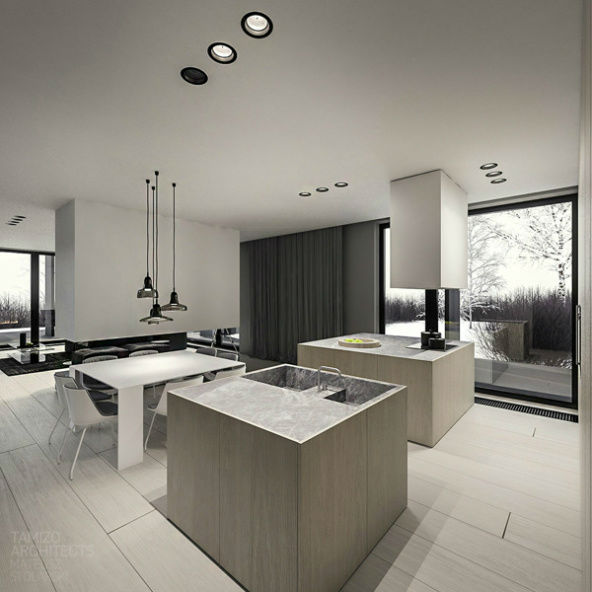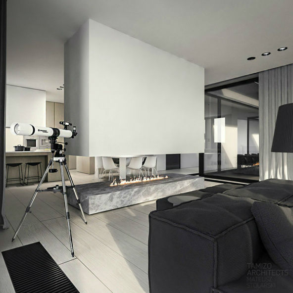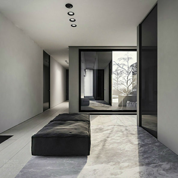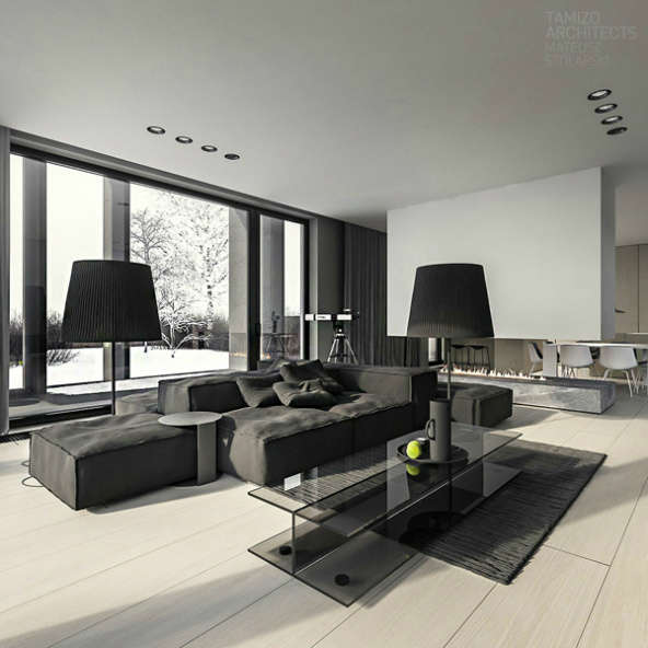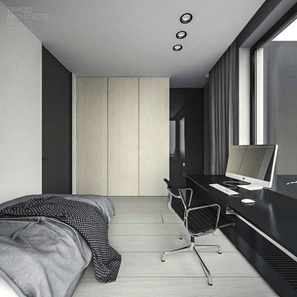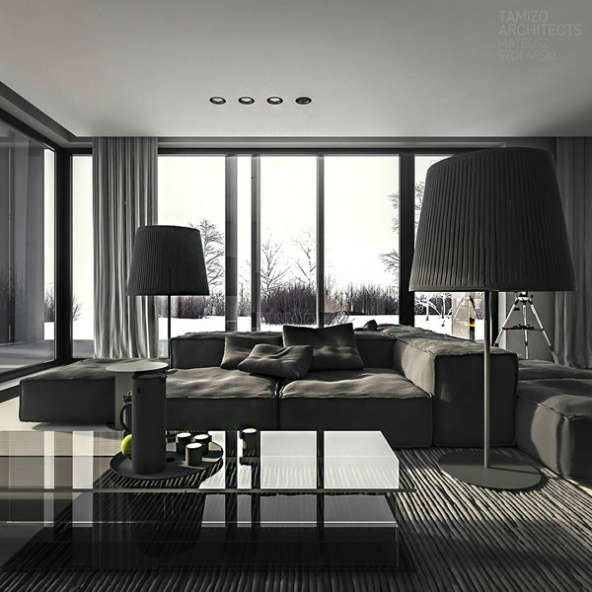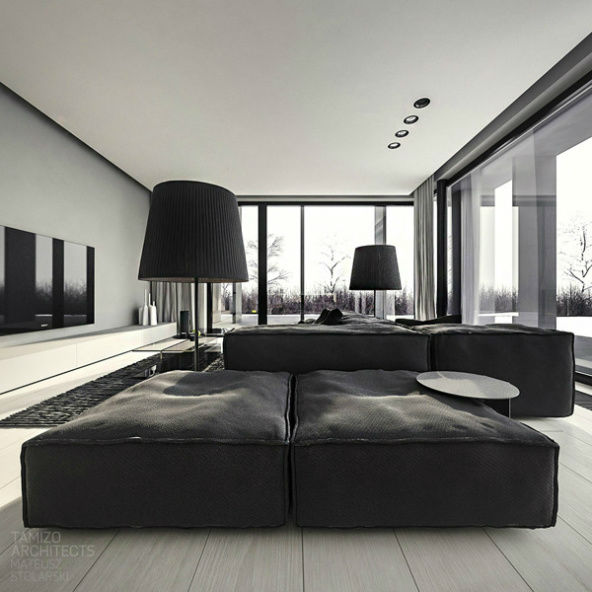 Aunque una decoración tan minimalista como está tendrá muchos detractores, lo cierto es que la elegancia del negro combinada con la simplicidad del diseño ejercen un subyugante efecto de sofisticación. Es un proyecto del arquitecto polaco Mateusk Kuo Stolarski, fundador de Tamizo Architects. Sus trabajos están siempre basados en la fusión del blanco y el negro, con muebles de líneas puras, de diseño equilibrado y simétrico, y una arquitectura de espacios amplios y abiertos. Aplica la justa proporción de colores oscuros para que no resulte excesivamente sombrío, añadiéndole la iluminación que le proporcionan los tonos claros. Aunque no apto para familias con niños, si que lo veo como el perfecto refugio masculino de un ejecutivo triunfador y cosmopolita.