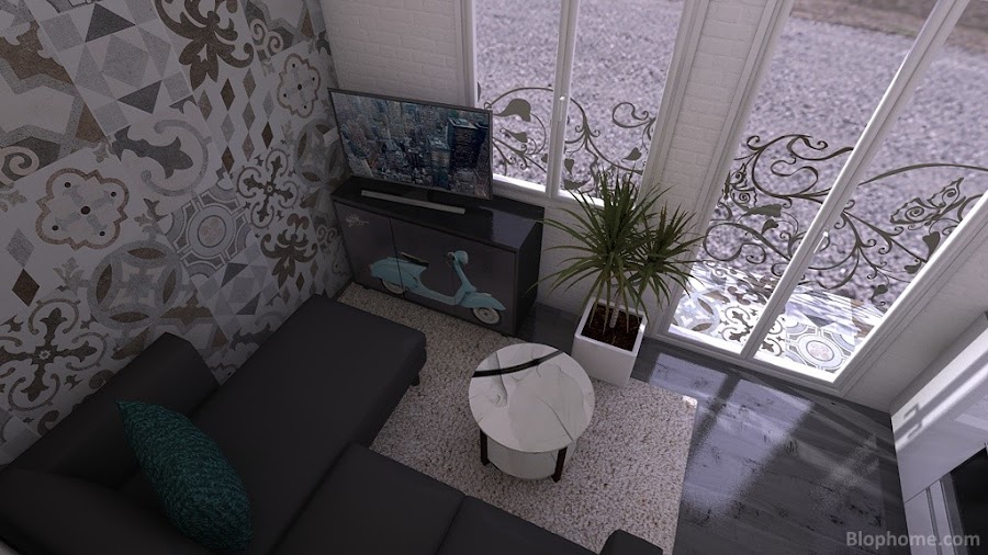 En homenaje a Barcelona le dedico este minipiso, en tonos oscuros por el duelo pero con algún toque azul. El ladrillo hidráulico en la pared y la forja del balcón muy estilo ArtNovo de Gaudí.