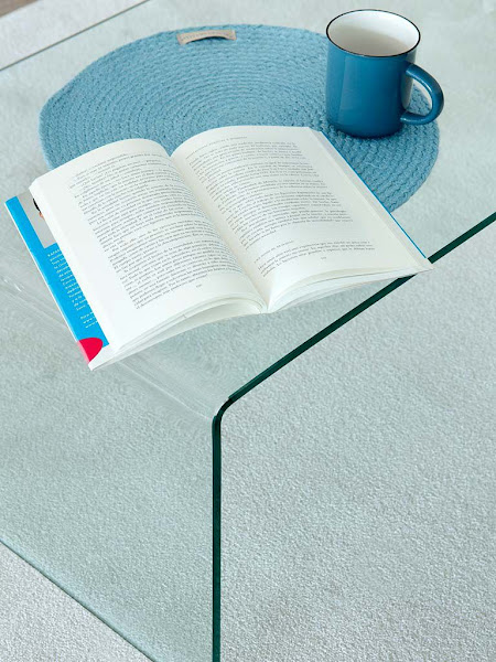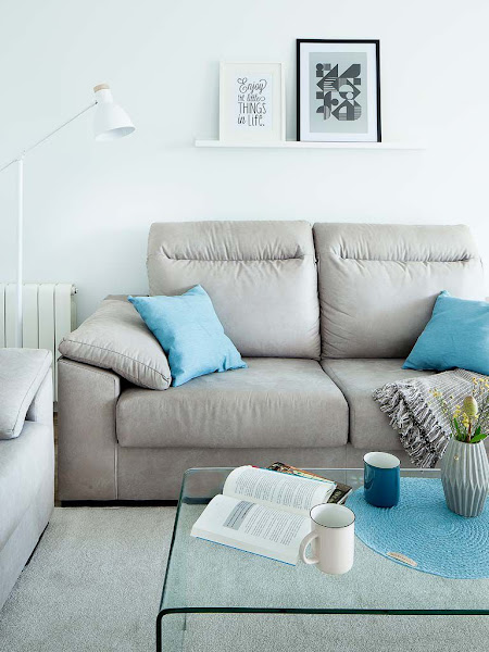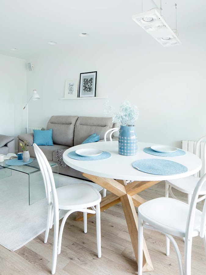 El salón es pequeño, pero está bien resuelto. Cuenta con un par de sofás en forma de L, una mesa de centro en cristal transparente, un módulo de audiovisuales, una balda sobre uno de los sofás y una escalera decorativa son los muebles escogidos para completar la estancia. En el comedor se opta por tonos azules para dinamizar los predominantes tonos neutros, a los que se suman también pinceladas en amarillo mostaza.