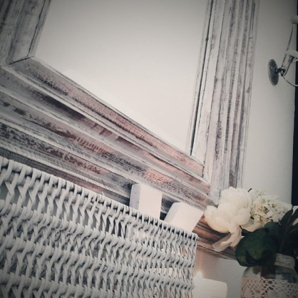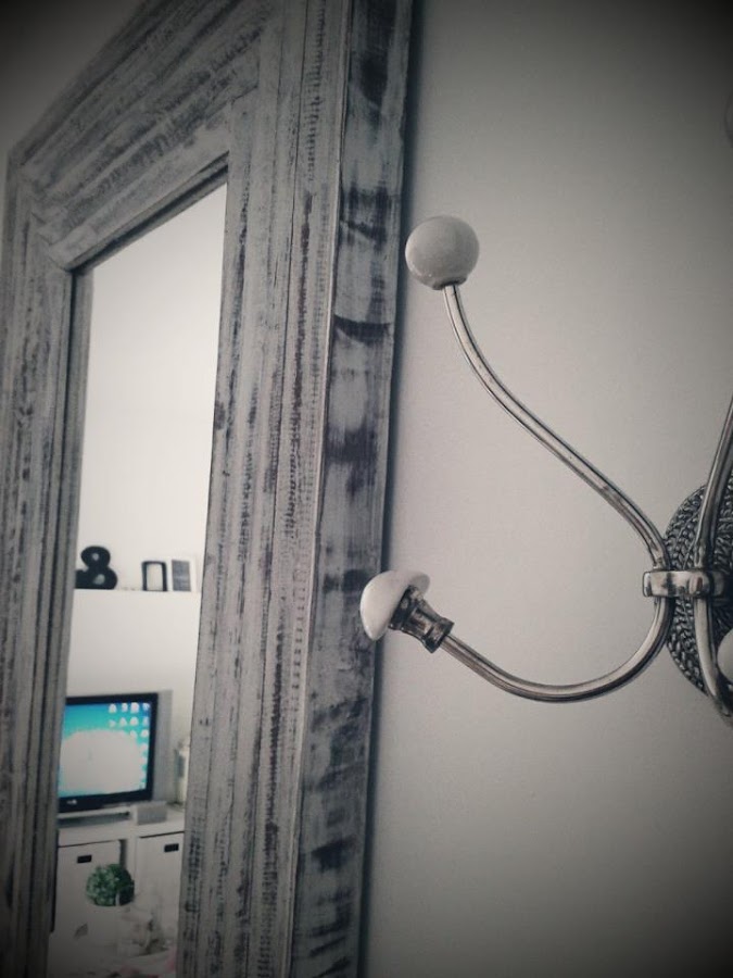 El espejo, de un gran marco de madera en blanco decapado tiene un aire entre rústico y shabby chic que le da una mezcla general exquisita.