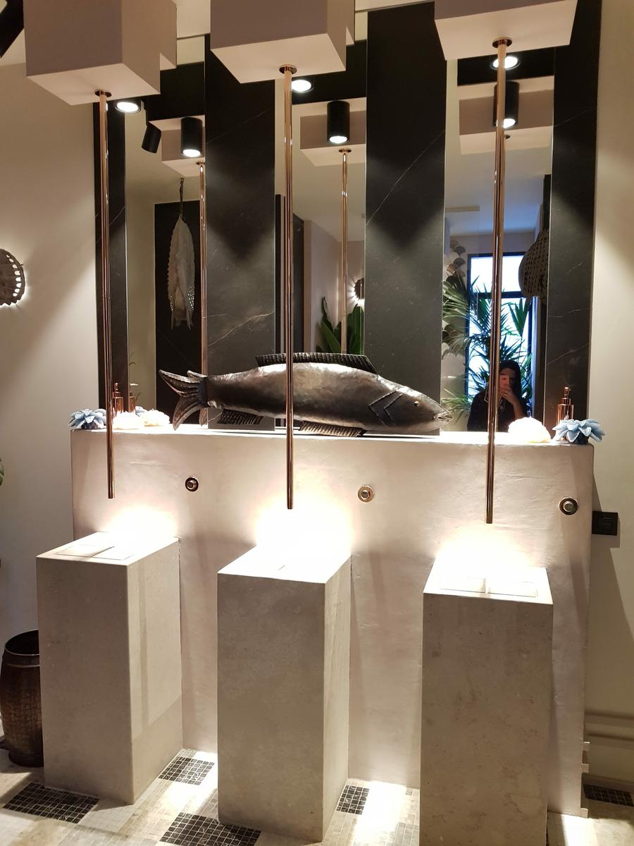 En este baño Blanca nos intenta transmitir la memoria del agua, que no es otra cosa, que el ciclo natural del agua tal y como lo veríamos en la naturaleza. Desde sus profundidades, (con esos corales submarinos) hasta sus cascadas como en esa ducha espectacular y por último, como este agua se filtra en la tierra, tal y como lo hace en estos lavabos de piedra.