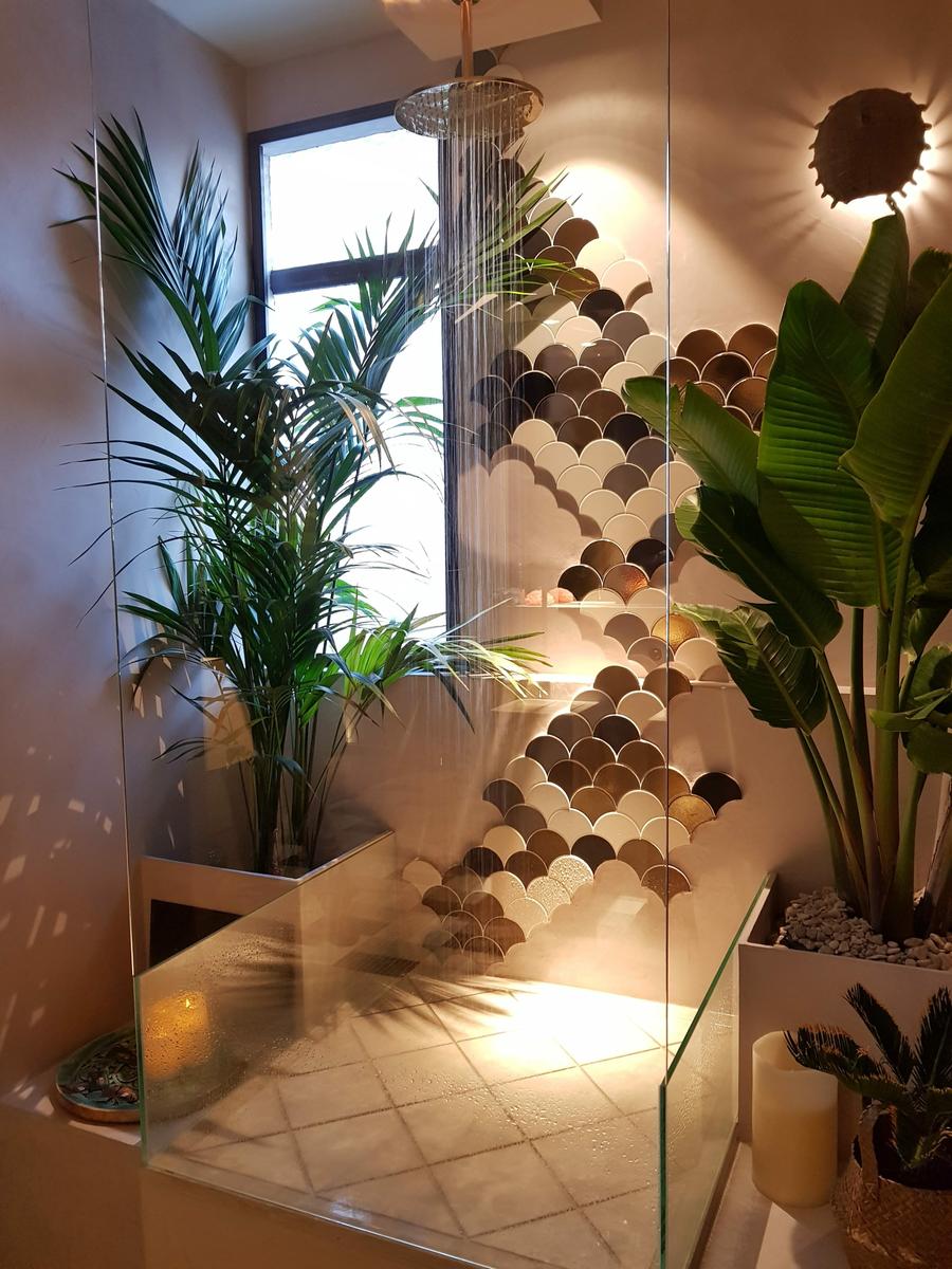 Un baño de lujo, en el que las figuras geométricas y las texturas se combinan para crear un ambiente femenino y mágico.