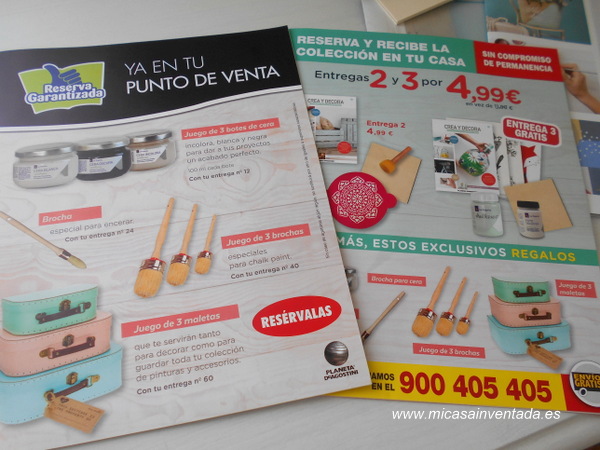 Planeta D´Agostini. Se trata de Crea y Decora con Chalk Paint. La verdad es que no soy muy coleccionista, pero esa en especial me llamo la atención por supuesto. Pensé, solo por 1,99 el número 1 merece la pena probar, ya que un bote de chalk paint de los mas pequeños cuesta unos 3 euros. La primera entrega viene con dos botes de pintura, mas pincel, fascículo, por 2 euros es muy barato.Tuve una grata sorpresa con esa colección, de verdad que me encanto todo el material. De muy buena calidad. Son pinturas de La Pajarita, que vosostros ya conocéis.