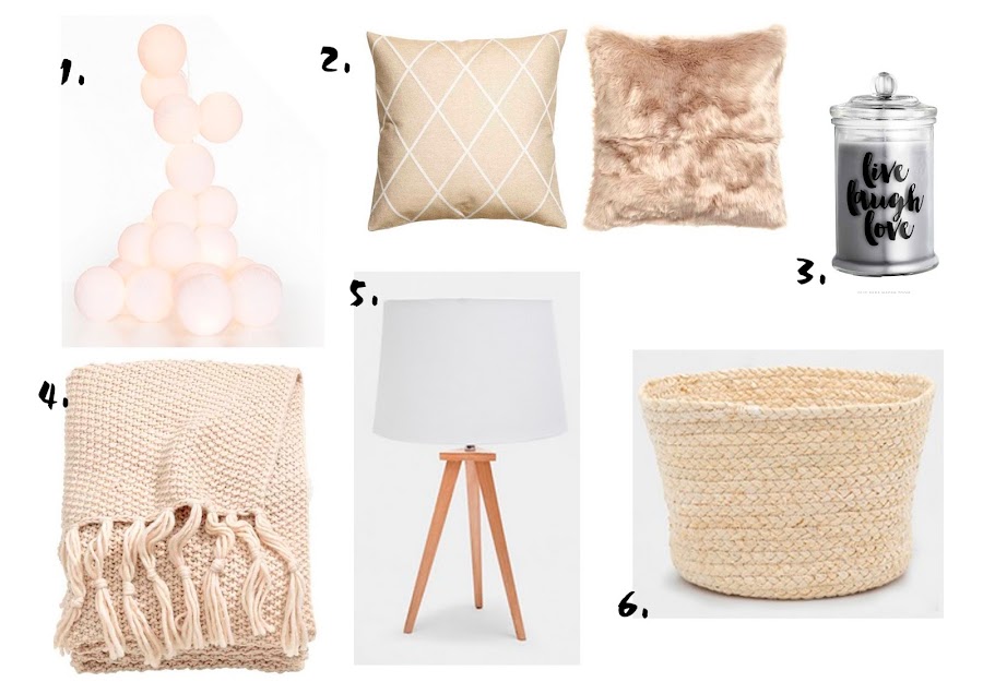 1. Guirnalda LUMINART | 2. Fundas cojines H&M | 3. Vela H&M | 4. Manta H&M | 5. Lámpara ZARA HOME | 6. Cesto ZARA HOME