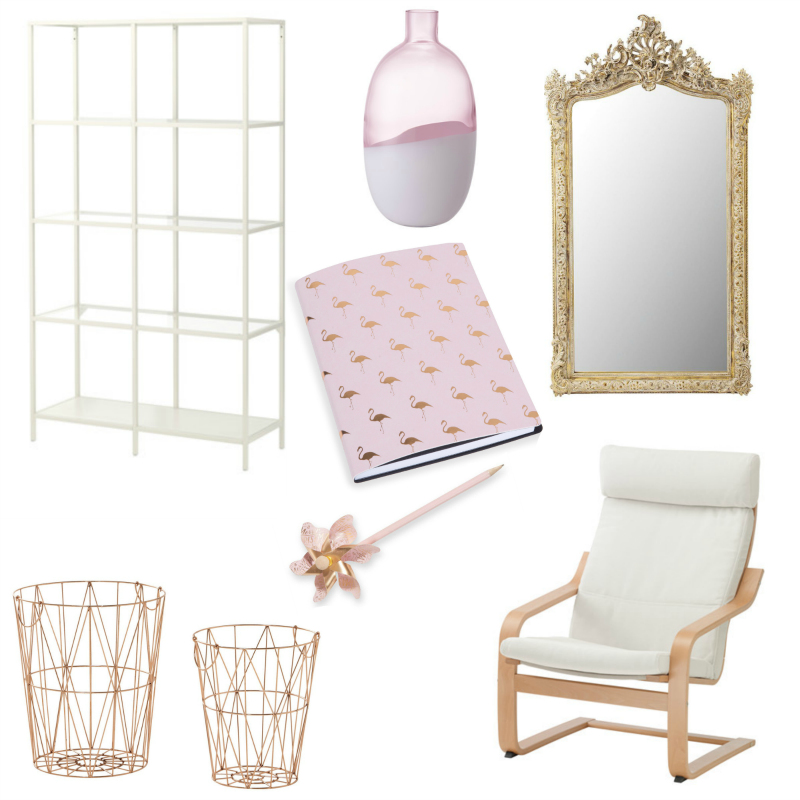 Estantería, sillón y jarrón de Ikea, cuaderno, lápiz, cestos y espejo de Maisons du Monde