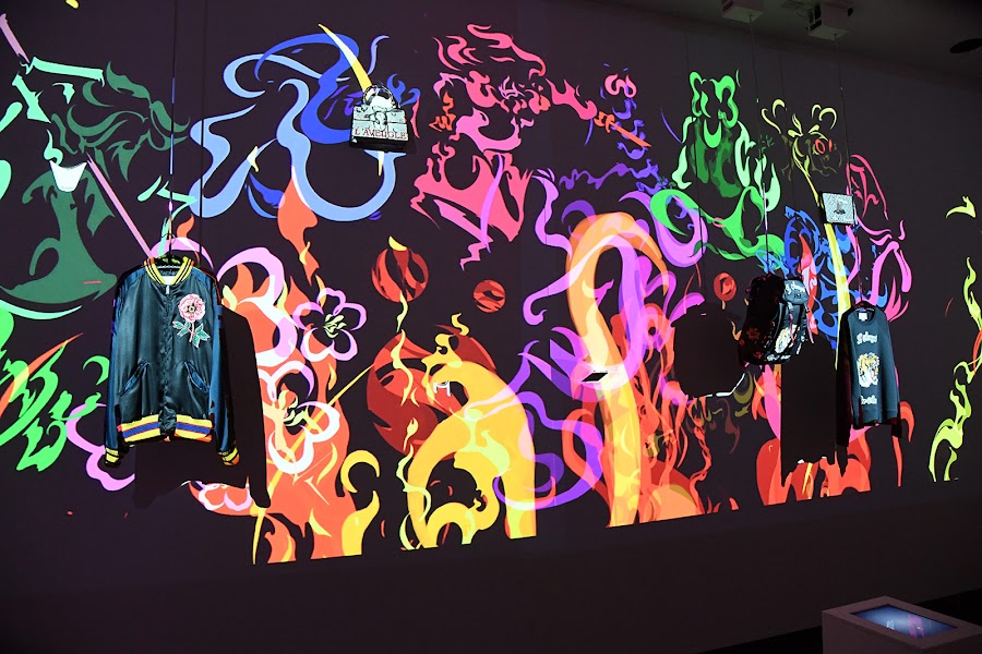 Con proyecciones sobre la pared, donde cuelgan prendas de la firma, el espacio va cambiando ofreciendo diferentes contextos. Simbología, humor y arte audiovisual potencian la imagen de marca de Gucci.