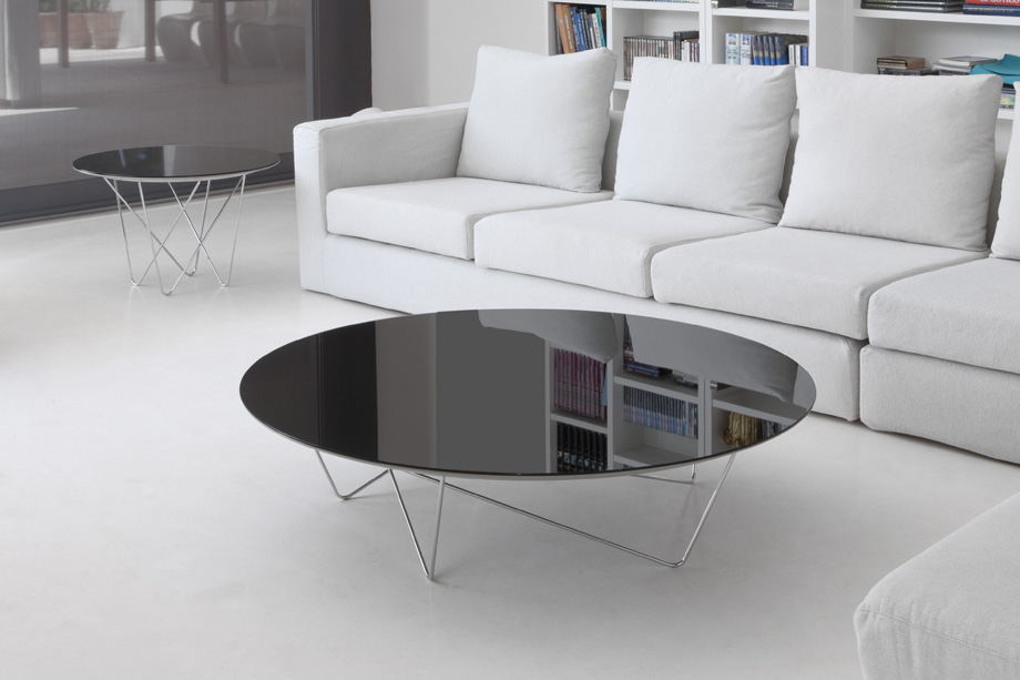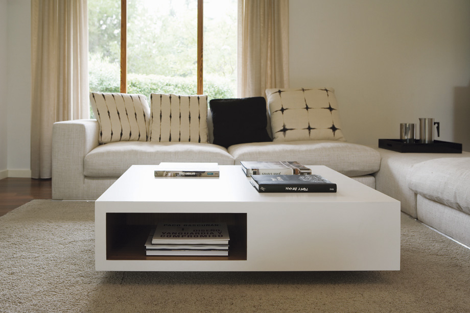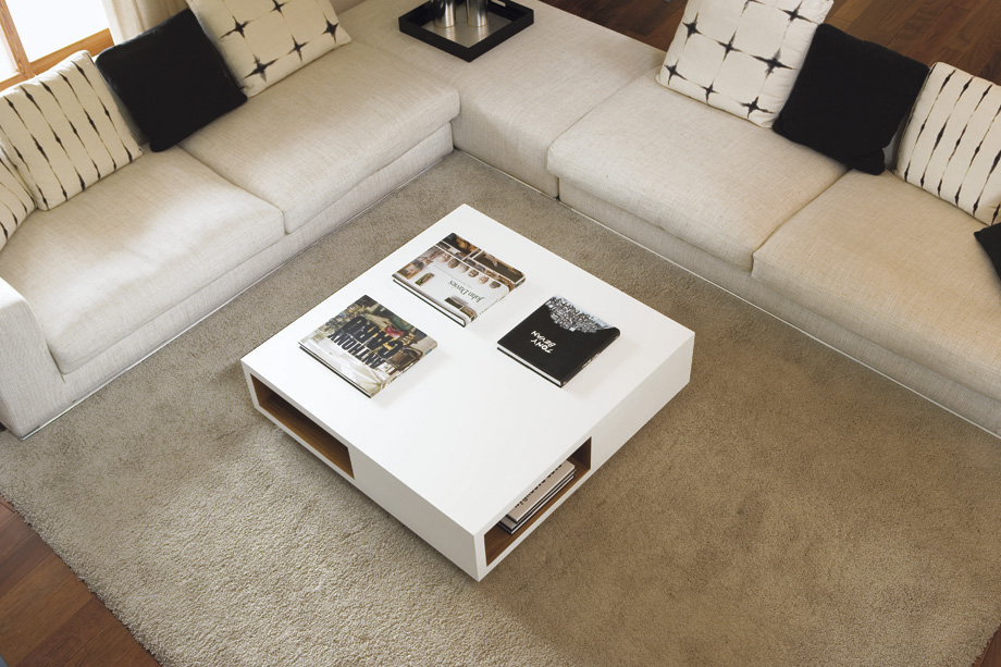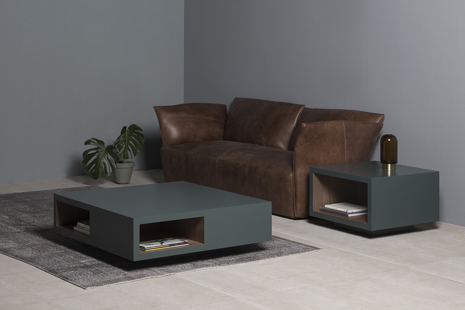 Vera es una mesa de café de forma cuadrada, sobria, que combina laca externa y diferentes acabados para el interior de los orificios de cubículo, tanto en chapa como en lacado en el mismo o en un color contrastante.
