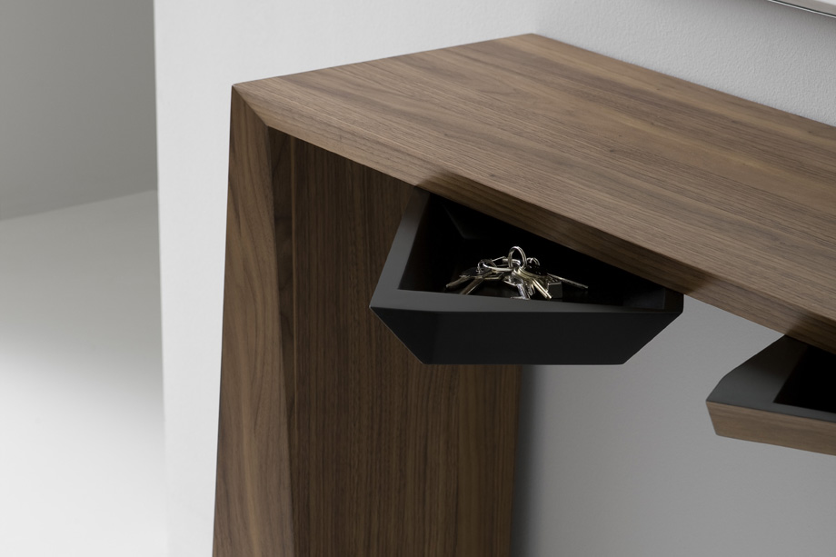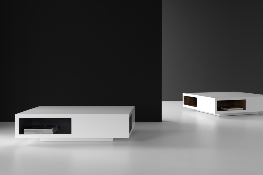 Vera is a square-shaped, sober coffee table, combining external lacquer and different finishes for the interior of the cubby holes, both in veneer and lacquer in either the same or a contrasting colour.