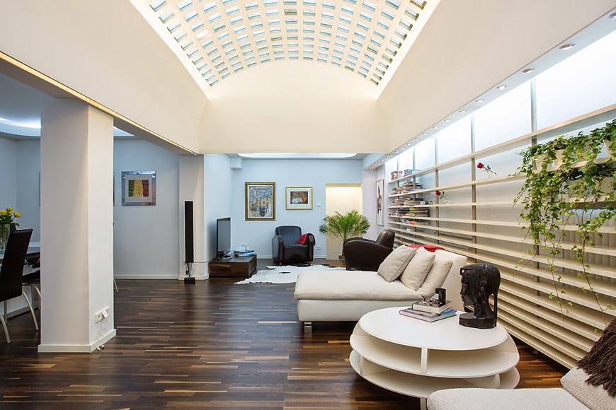 El salón del piso de hoy mola mucho, lo primero que sobresale es el techo abovedado, genial para conseguir más luz natural, teniendo en cuenta la escasez de ventanas que tiene.
