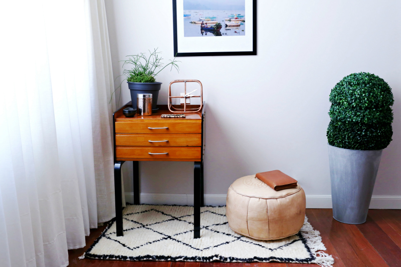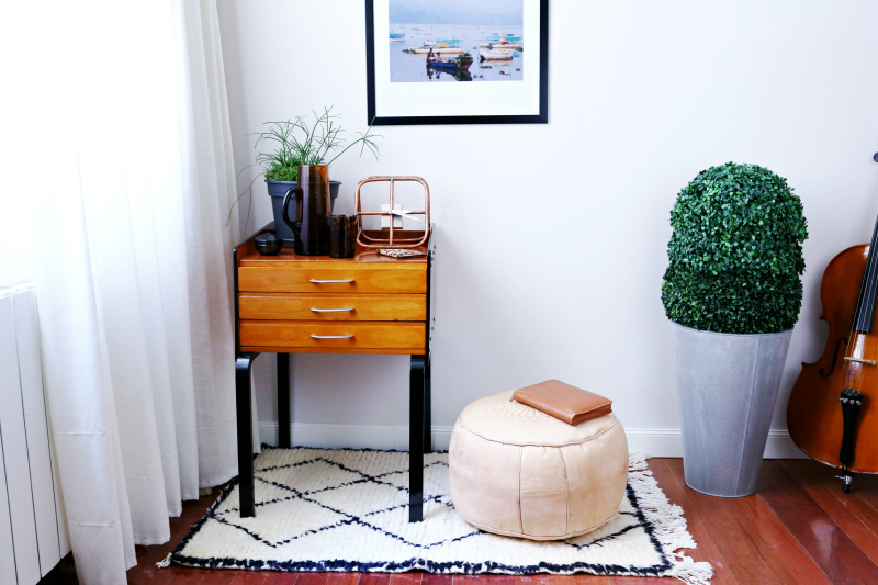 viñeta con el puff y la alfombra que traje de Marruecos, un nuevo macetero