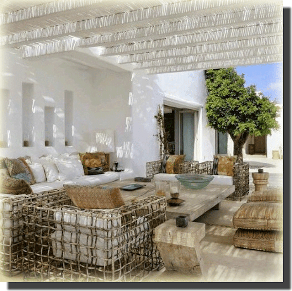 En porches con techo, coloca muebles de madera y fibras naturales.