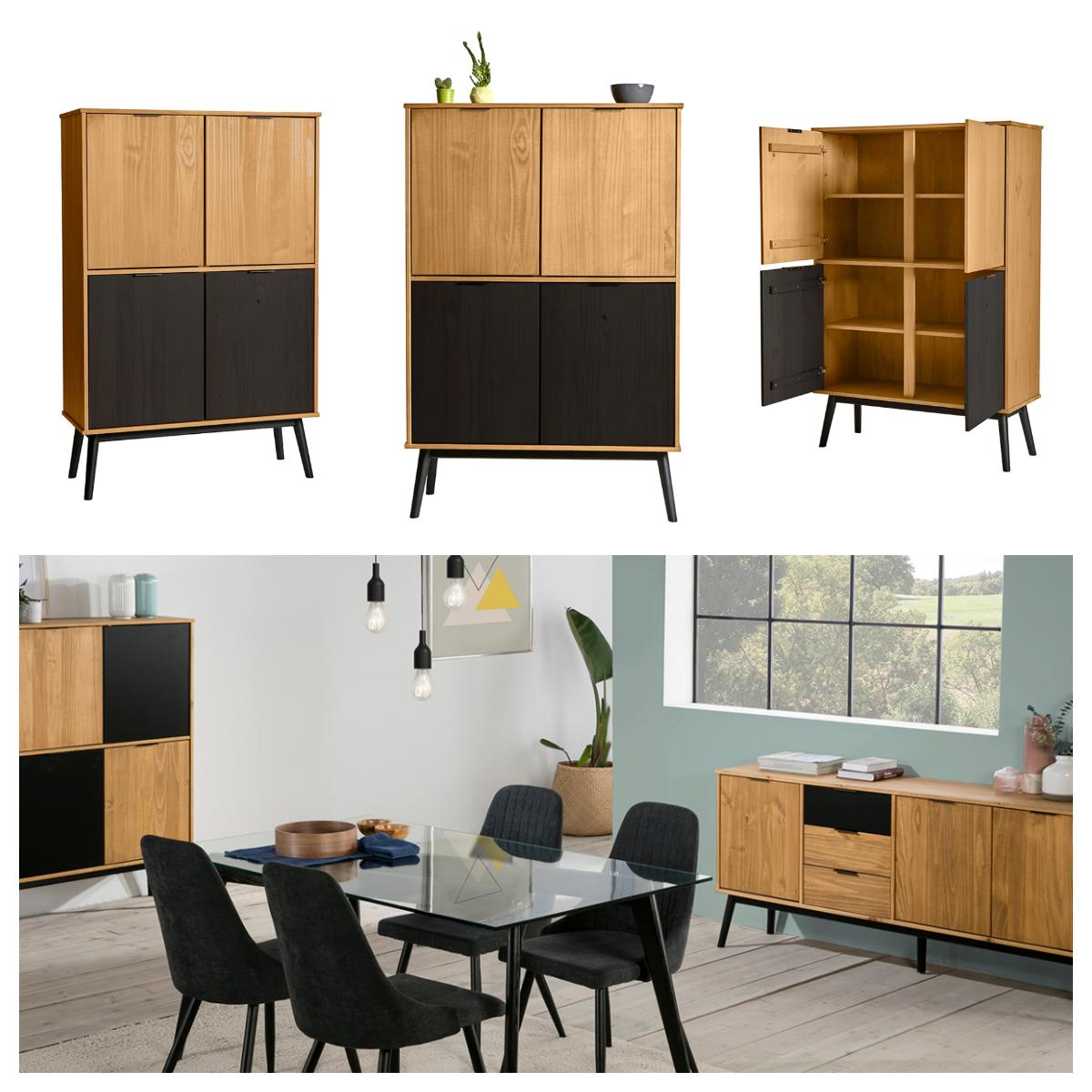 Este mueble cuenta con diversas puertas que guardan compartimientos de almacenaje, cajones y baldas dentro de un diseño discreto que resulta ideal para complementar decoraciones con estilo nórdico, moderno, minimalista o con aire vintage.