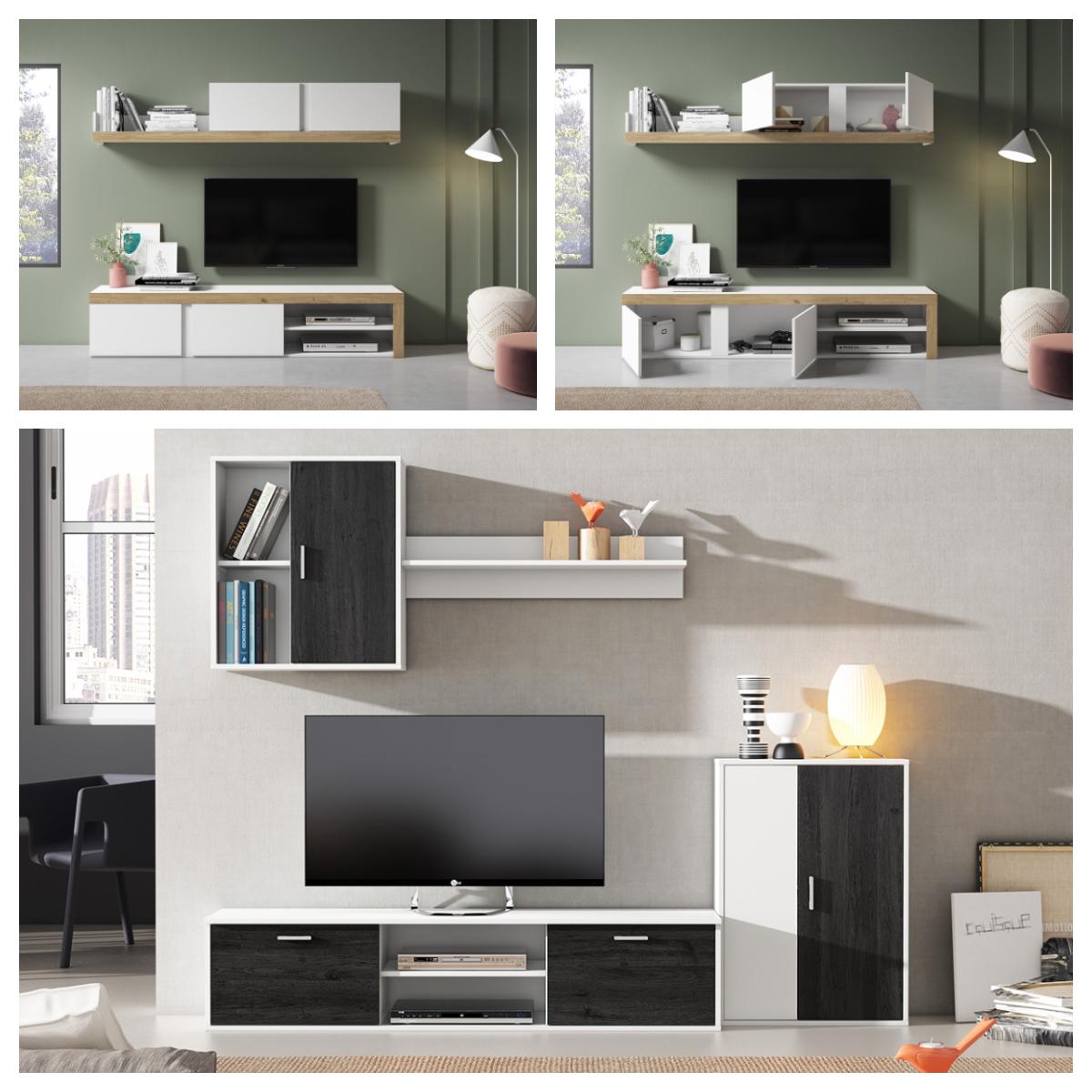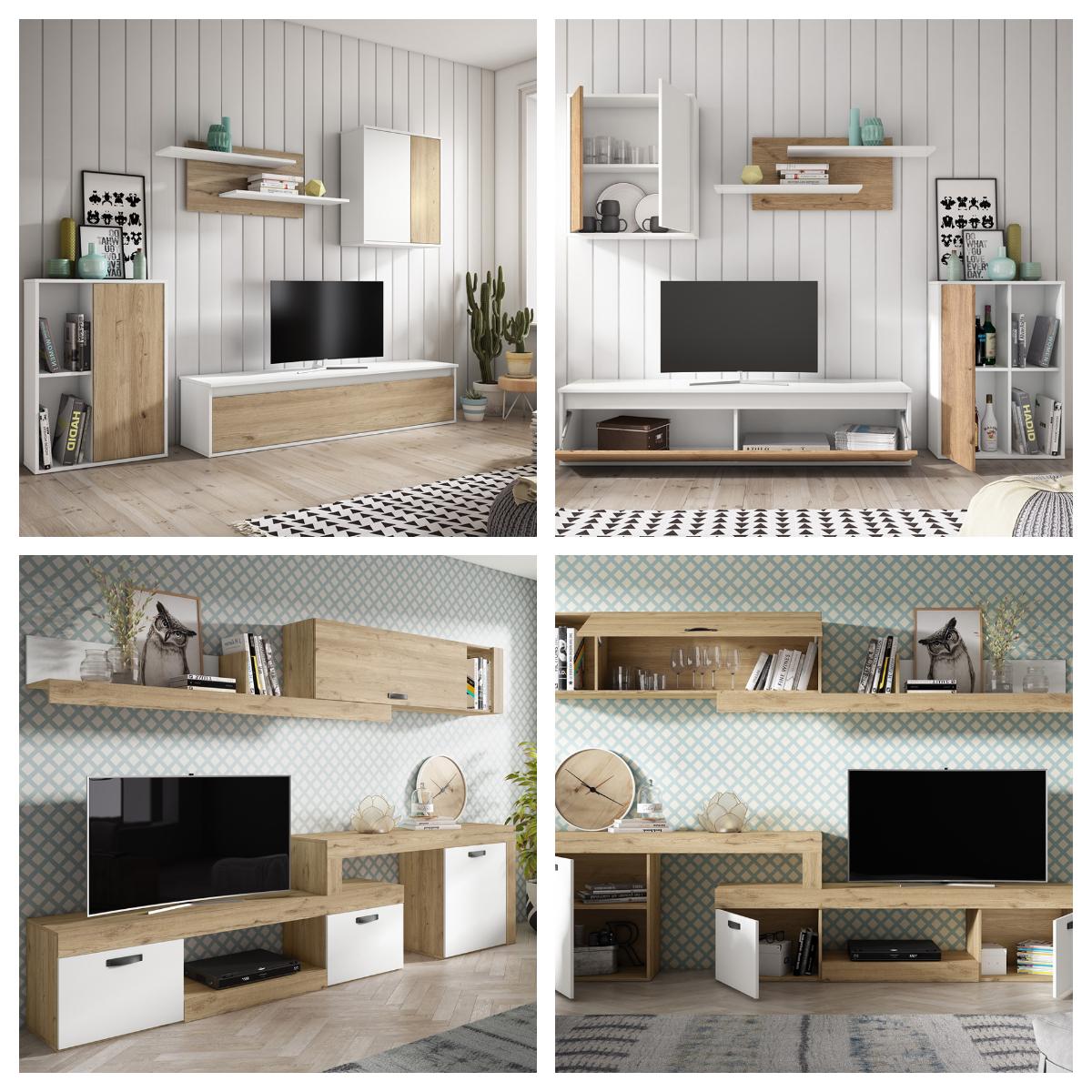 Muebles de salón como el modelo Niké, elaborado en blanco mate con detalles en madera natural y el modelo Selene de color blanco mate y detalles en color negro con vetas de madera marcadas son ideales para amueblar espacios donde se desea acentuar el estilo moderno.