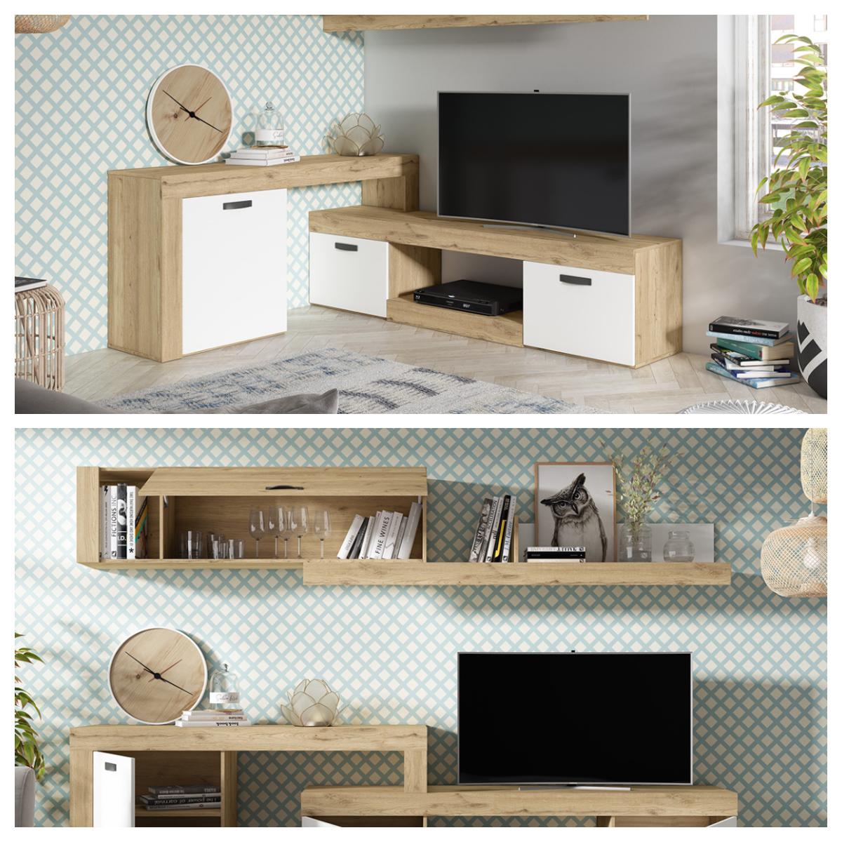 El contraste del color blanco con el tono rubio de la madera natural hacen del mueble de salón Hera Extend el modelo ideal. Sobre todo aquellos donde se desee fusionar un toque de estilo nórdico y potenciarlo con un una dosis de decoración moderna.Este mueble representa la fusión perfecta entre calidez, sobriedad, pulcritud y orden; todos aspectos necesarios en ambos estilos decorativos.