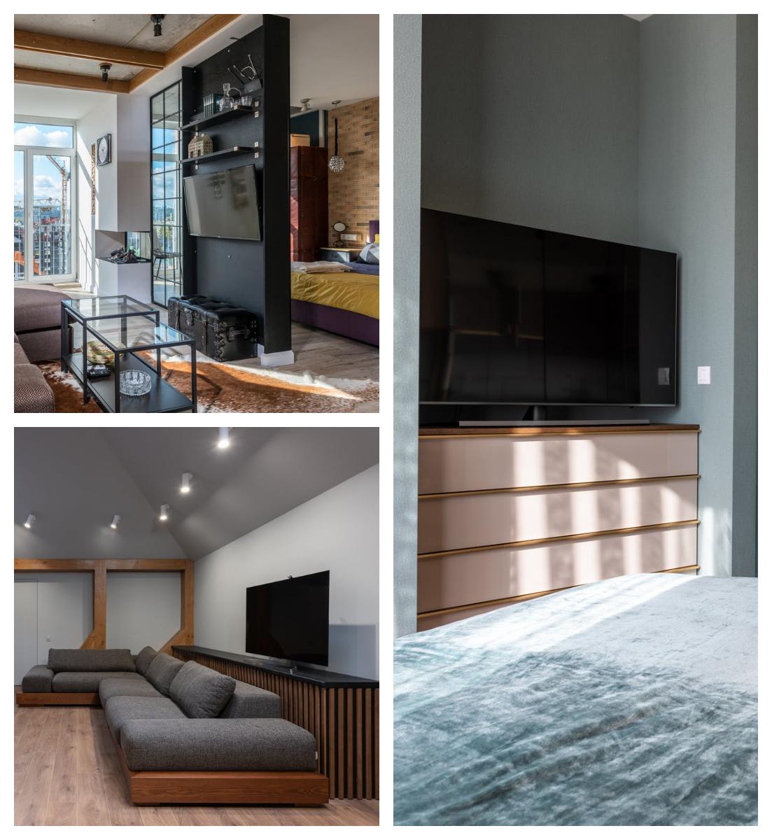 En el caso de los muebles a medida, existen muebles de TV altos y modulares empotrados a una pared que presente condiciones específicas y favorables para soporte de peso, entre otros detalles; estos pueden estar elaborados en yeso, pladur, drywall u otros materiales sencillos de complementar con detalles en madera u otros materiales.