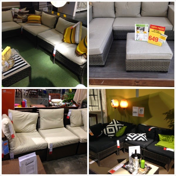 Miré varias opciones de muebles para exterior, al final nos decantamos por unos módulos de fibra sintética de Leroy Merlin, me parecía una opción cómoda porque siempre puedes mover y cambiar los muebles de sitio.