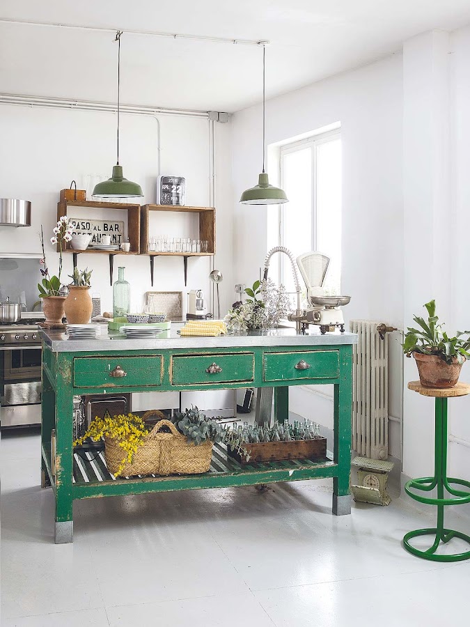 A medio camino entre lo bohemio y lo industrial, aunque mas cerca quizás de este ultimo, encontramos este precioso loft lleno de luz, vitalidad y piezas de mobiliario recuperado. Para mi esto último es maravilloso porque este es un buen ejemplo para ver que los muebles antiguos tienen una segunda oportunidad si le cambiamos el aspecto. Dentro de este loft podemos ver la isla de la cocina (que parece una mesa de alguna vieja carnicera o así), sillas, los sofás (que tienen aspecto de ser de jardín), los muebles estanterías, baúles, la mesa de escritorio del piso inferior, el espejo y el mueble del lavabo...... y un montón de detalles, que por mencionar uno me quedo con el peso que esta sobre la isla. Cosas que al fin y al cabo de la personalidad y la vitalidad que este loft tiene.