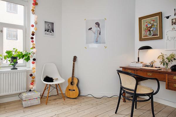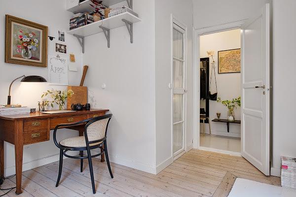 Por su parte el dormitorio y el estudio se decoró alternando muebles viejos, como las mesillas, el escritorio o el armario blanco bajo, con piezas de diseño y actuales, una mezcla muy serena y acogedora.