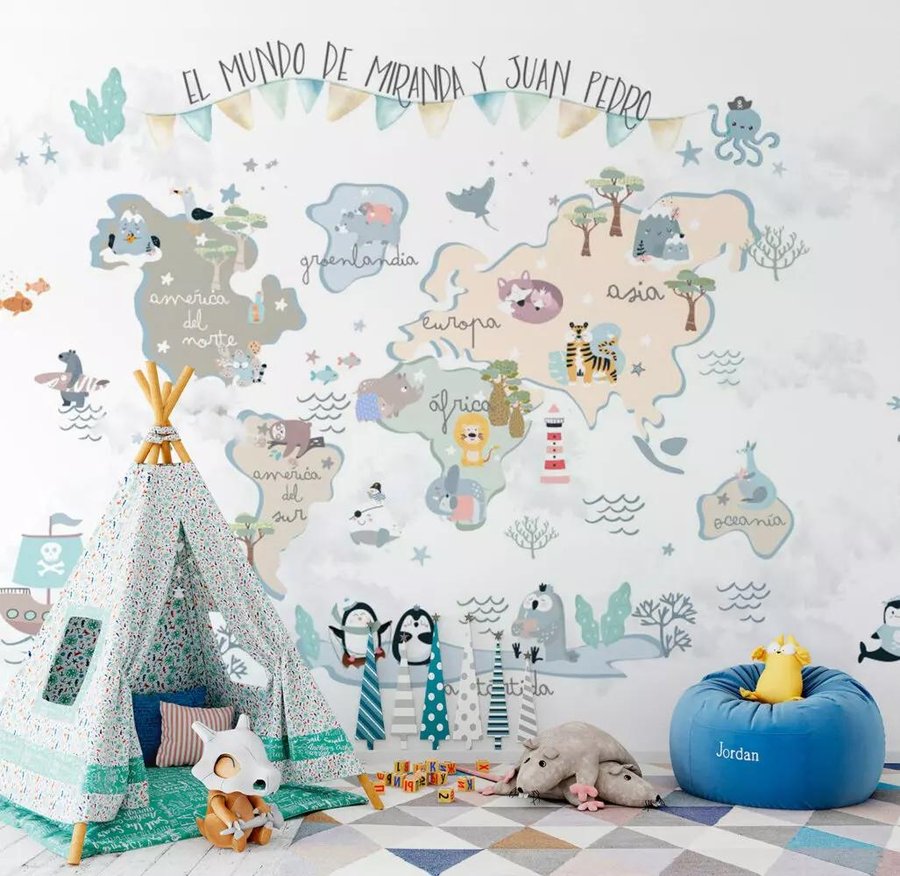 Ahora que ya conocemos el producto y los primeros pasos a seguir, veamos unas ideas para incorporar los murales de pared al dormitorio infantil y su decoración.El mundo al alcance de la mano o paseando por la jungla