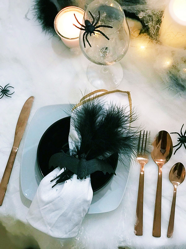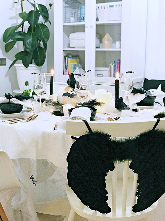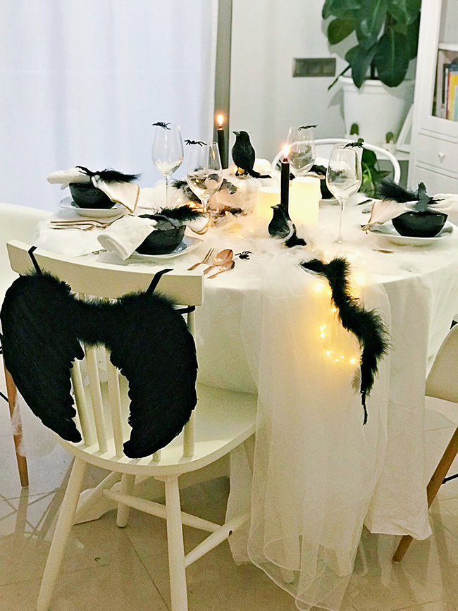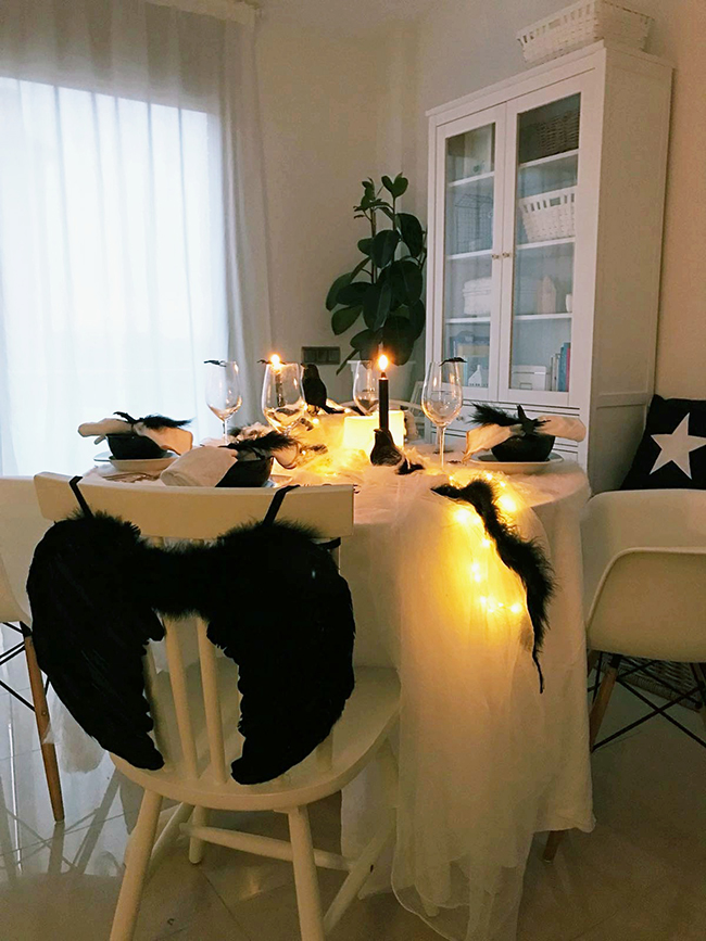 Una boa negra y plumas a juego hicieron el resto, una mesa muy tétrica, que hace perfectamente su función en blanco&negro con los cubiertos cobre de Primark y la guirnalda de luces de Liderlamp como único toque de color.