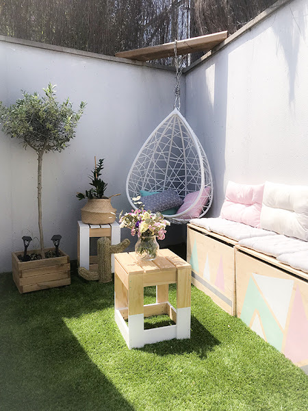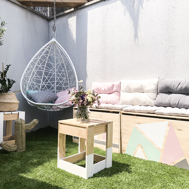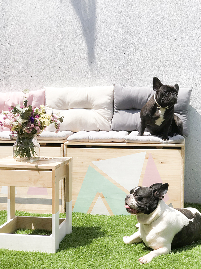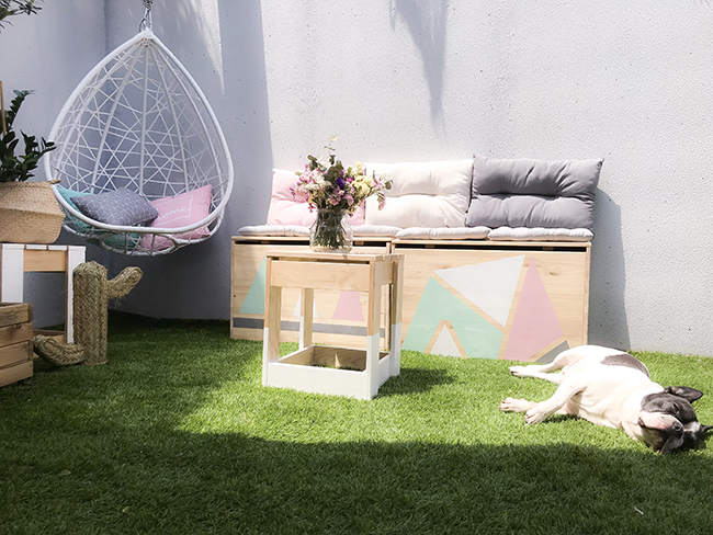 Eso me sucedió a mí este día de calor y solecito, solo tenéis que ver a OKER echándose la siesta en el césped. Además, tenía pendiente estrenar los baúles y taburetes de Astigarraga Kit Line y crear un rincón así de bonito con ellos.