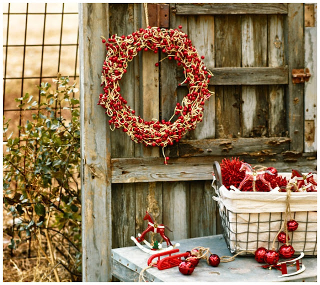 Un ambiente bucólico de leña, chimenea , velas encendida, candelabros rústicos en forma de rama y las tradicionales bolas rojas con dibujos de nieve o ciervos....mas navideño y hogareño imposible.