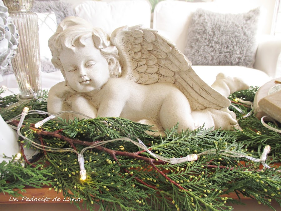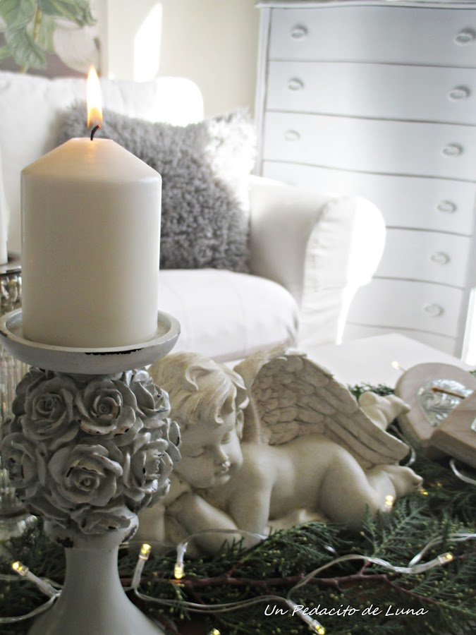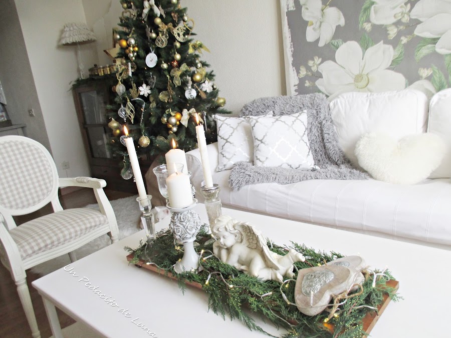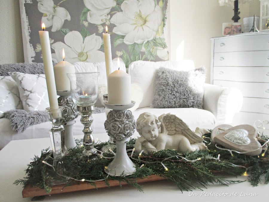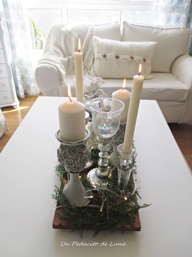 Aprovechando la bandeja-tabla que había hecho para las calabazas, hice un centro navideño con velas, un angelote y corazones, ramas de pino y luces.
