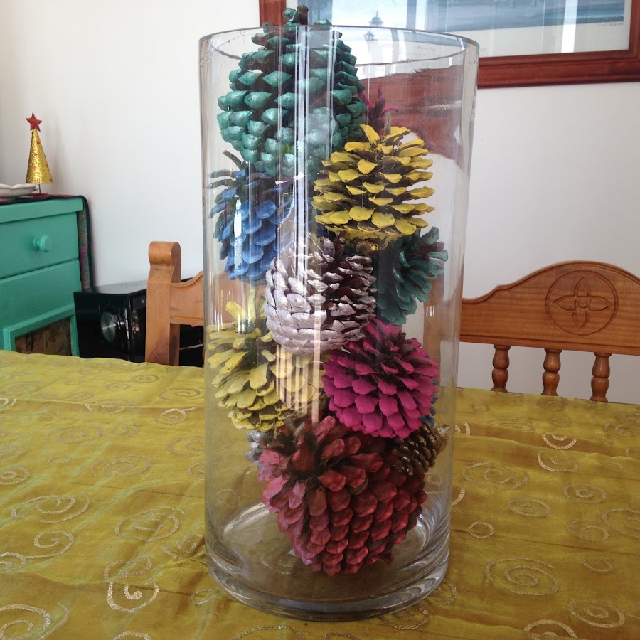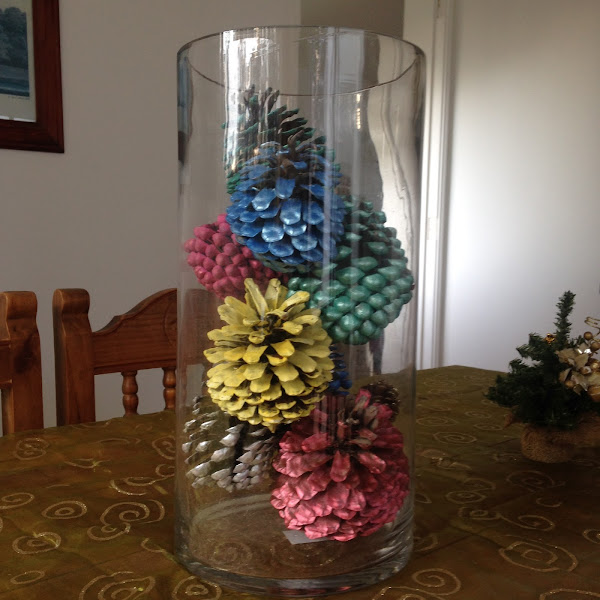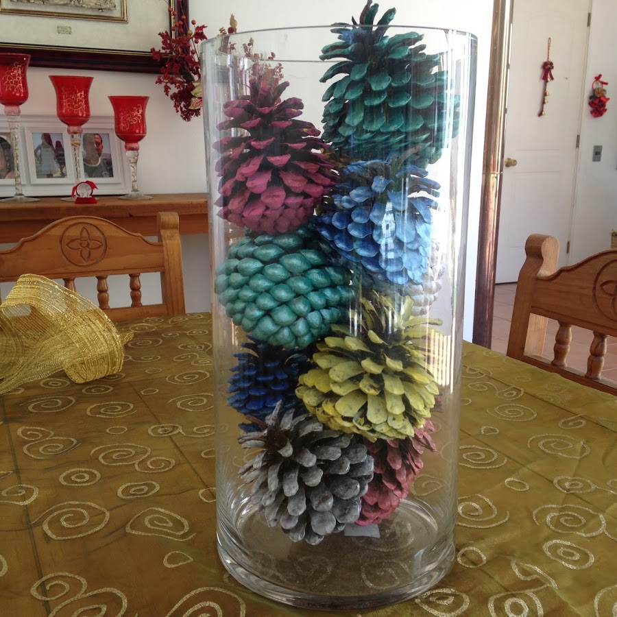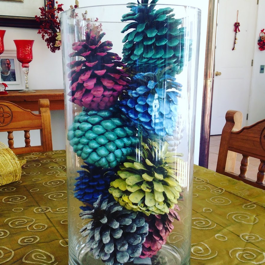 Navegando por internet y mirando los bellos posteos navideños que asoman en la red a cada instante, el año pasado encontré una foto maravillosa de un florero (o base) de cristal lleno con piñas de pino pintadas en distintos colores.