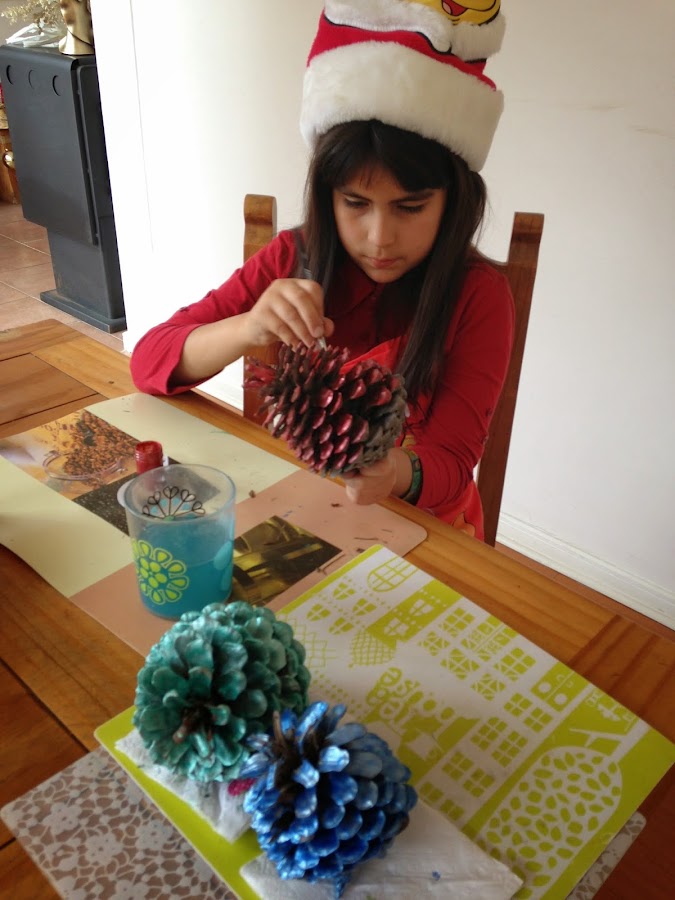 El asunto es que, en base a esta foto que encontré, mi hija pequeña Magdalena se hizo del proyecto y seleccionó un grupo de piñas de distintos tamaños que teníamos en una caja, tomó todas las pinturas (témperas) que quedaron del colegio, en especial unas de colores metalizados que les compré para algún proyecto escolar. Y se puso, literalmente, “manos a la obra” y quiero compartir este proyecto con ustedes en el reto de decoración de LA CASA DEL AÑO en Navidad, porque ni niñita ¡se pasó!