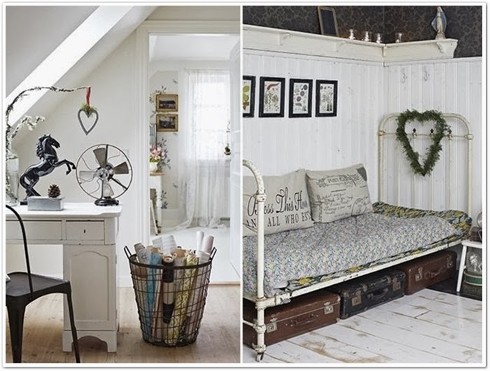 Tengo que reconocer que el dormitorio romántico con ese tocador y esa jaula en el alfeizar me han conquistado.....Y que me decís de las antiguas butacas de cine en la zona de trabajo debajo de ese gran reloj negro?. Piezas vintage, flores y detalles navideños que hacen de esta casa una casa especial.