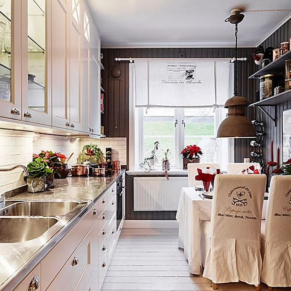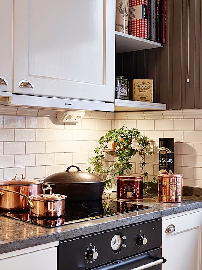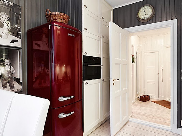Un montón de detalles en rojo, desde las flores de Pascua al frigorífico, destacan en la decoración de este apartamento de 49 metros cuadrados en Bagaregården, Suecia, con una decoración muy navideña y elegante.