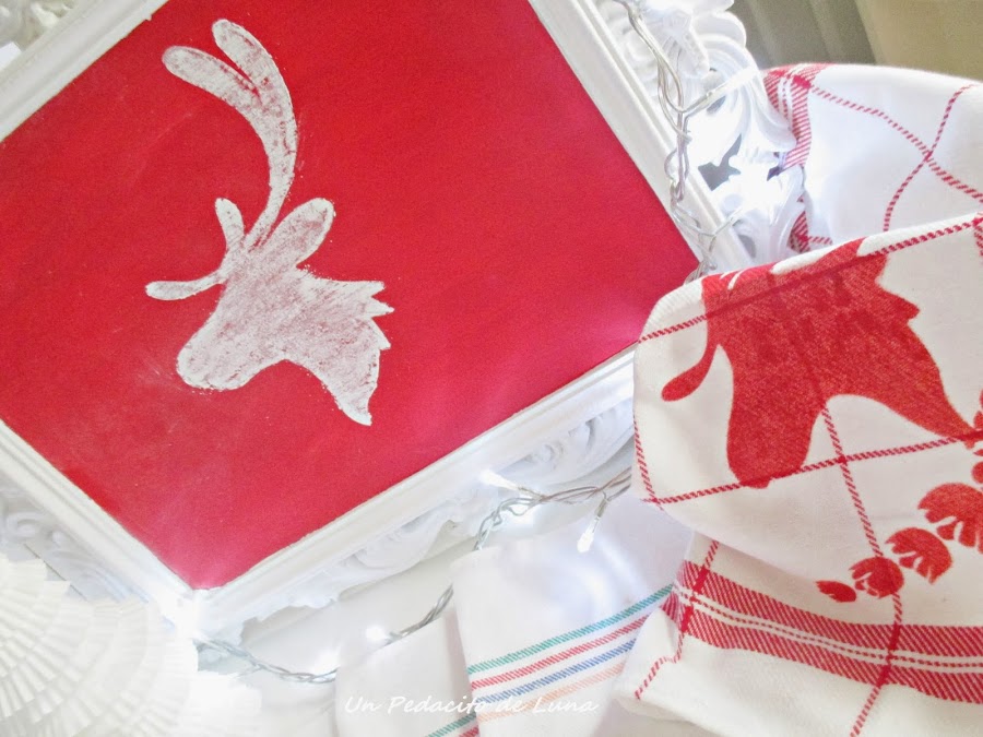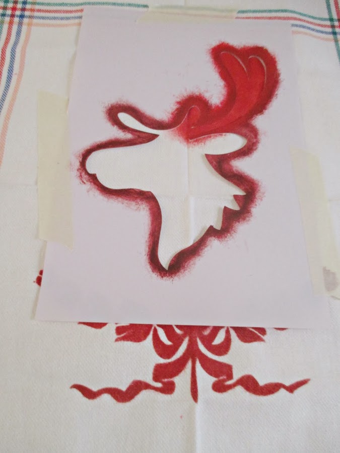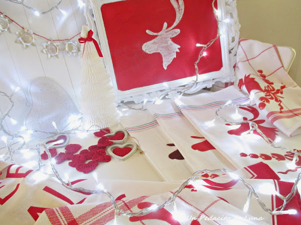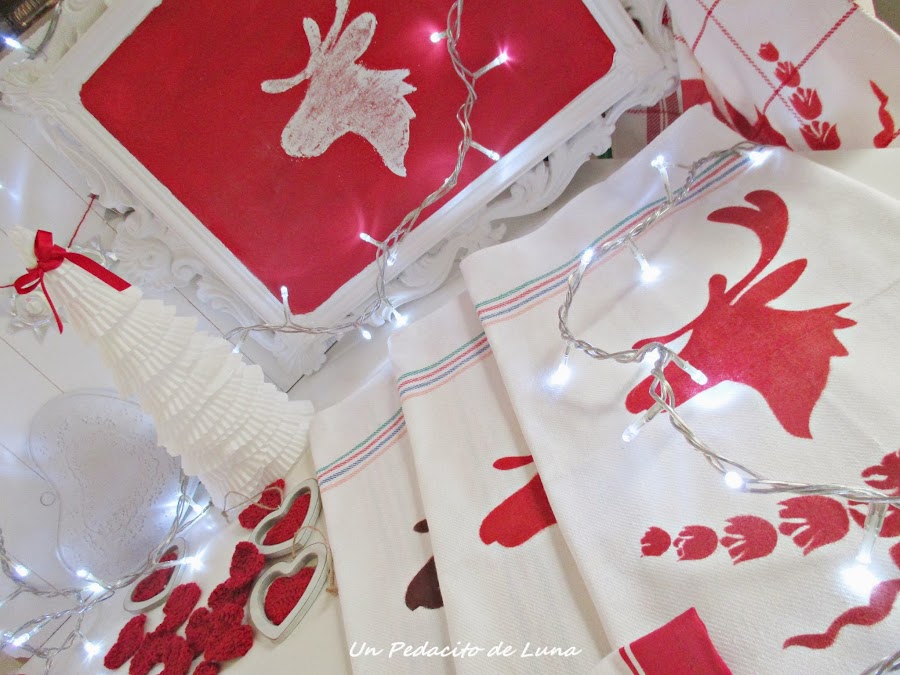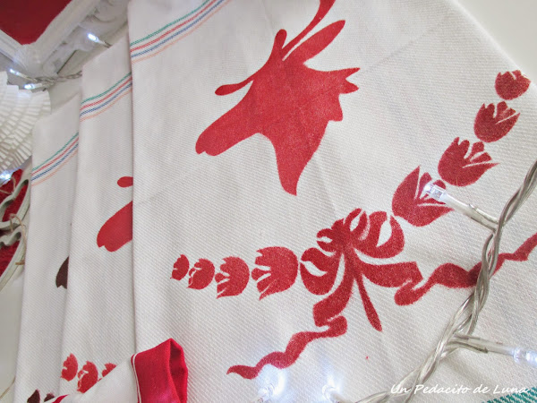 Lo siguiente fueron unos buenos paños de cocina, en algodón, que estarcí con "mucha mano izquierda" (qué difíciiiil) y con unas plantillas de Lucía de, "Momentos Vintage" y otras más de las navideñas que tenía en casa....
