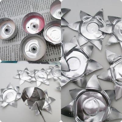 Consiste en preparar un cono de papel o cartón dejando recta la base, cortar el fondo de las cápsulas e ir pegándolas alrededor del cono....