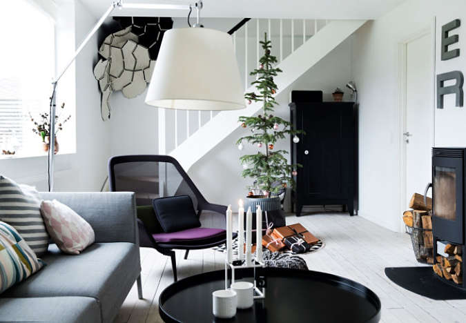 Ramas, piñas y plantas ornamentales completan la simple decoración navideña, junto a un exiguo árbol de navidad que luce con unas cuantas bolas y unos regalos de navidad en su base. Es de esas casas que no necesitan mucho más. Un minimalismo latente en sus estancias, una elegante visión del estilo nórdico, y una armonía total que me ha fascinado por completo.