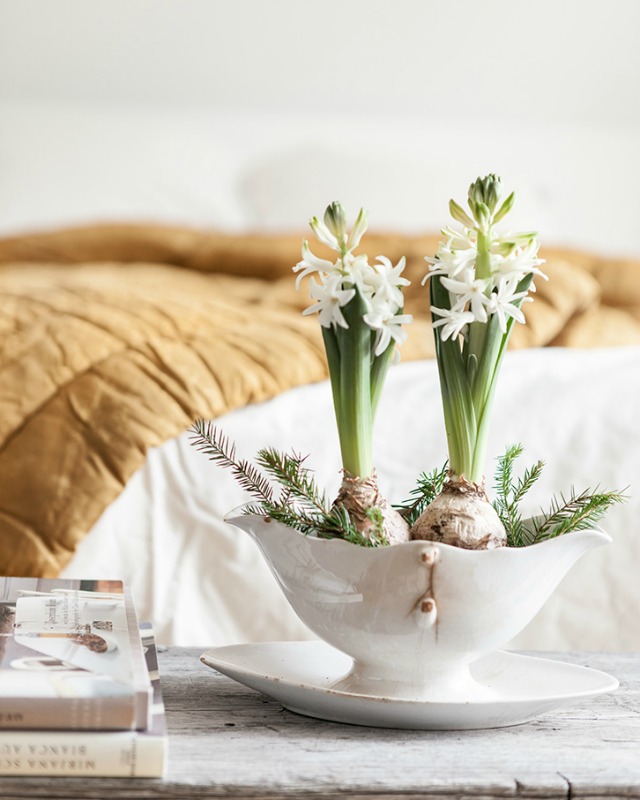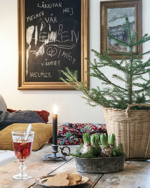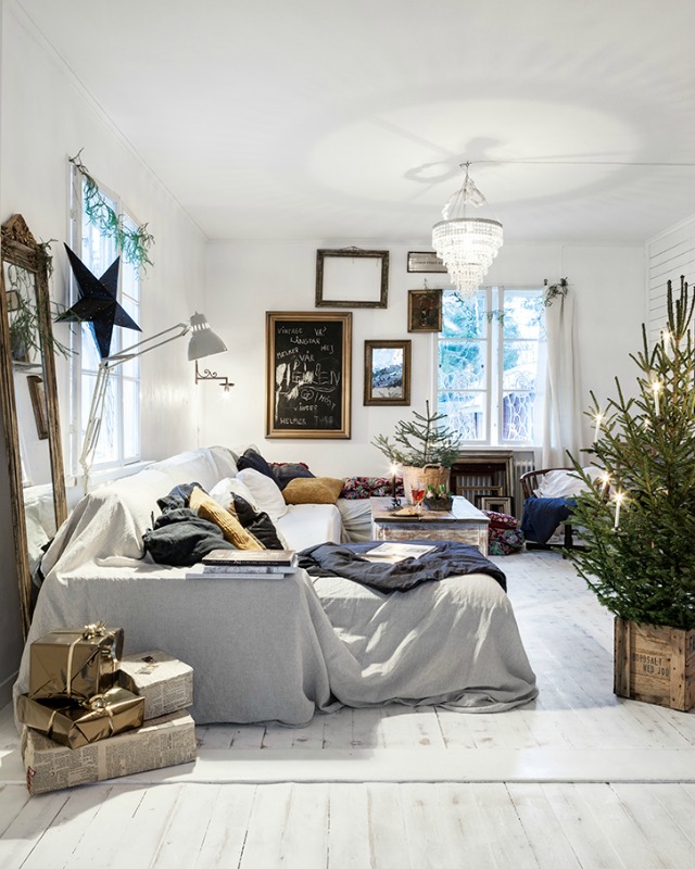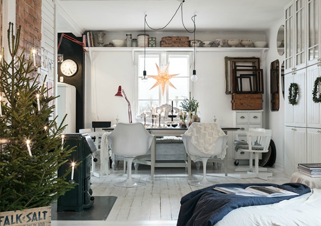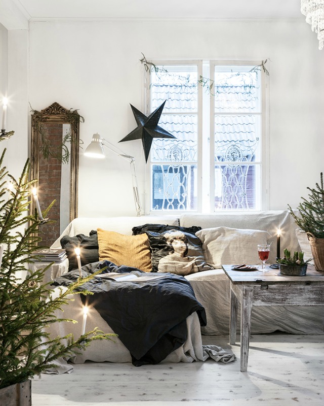 Un gran estrella colgada junto a la ventana en color negro, abetos de diferentes tamaños introducidos en una caja de madera o un cesto de mimbre, bulbos de jacintos en macetas de metal desgastado y regalos envueltos en papel de periódico crean una decoración de Navidad diferente de estilo vintage. Una mezcla de elegancia, sobriedad y calidez para recibir la Navidad.Os dejo con las imágenes de esta preciosa vivienda
