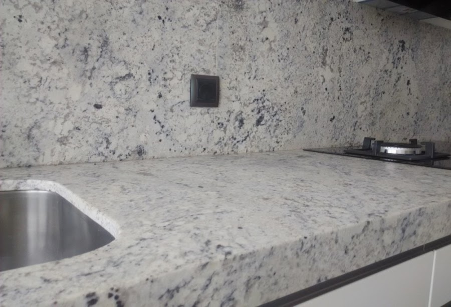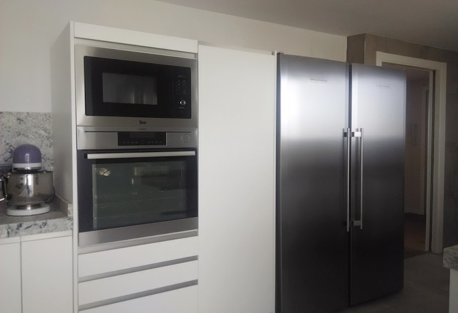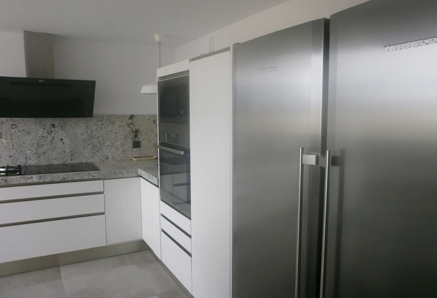 Los muebles son un modelo totalmente liso lacado blanco satén con el tirador de aluminio tipo uñero y se distingue por su terminación limpia y sin juntas, un detalle que podemos valorar más en los colores muy claros. Por otro lado, la encimera es un precioso granito gris perla de acabado envejecido con canto de 6 cms. ingletado y con el que se ha forrado también la pared frontal, que la protege de salpicaduras y le aporta mucha vistosidad al diseño.