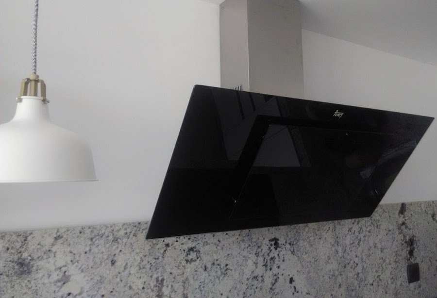 En este caso, la laca blanca, el granito gris y el cristal negro, se mezclan perfectamente para lograr un espléndido y funcional conjunto, a pesar de su aparente sencillez.